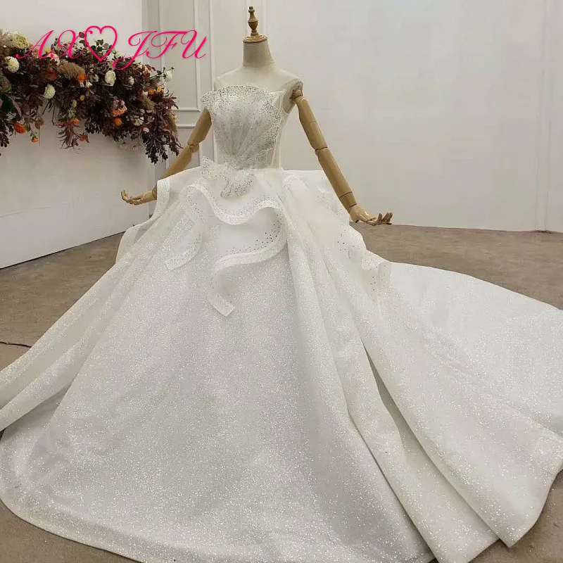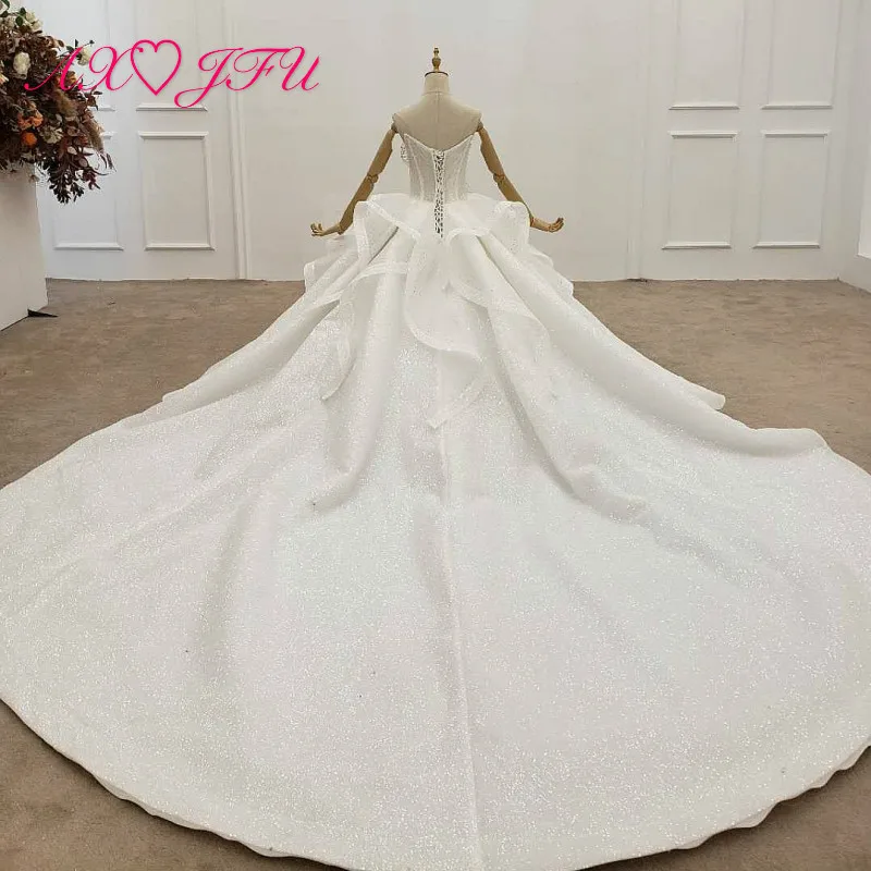 Special Offer AXJFU الفاخرة الأميرة الخرز كريستال زهرة بيضاء الكشكشة الدانتيل اليدوية حمالة العروس قطار طويل الوهم فستان الزفاف 99529 Discount 50% Today!