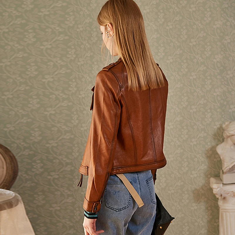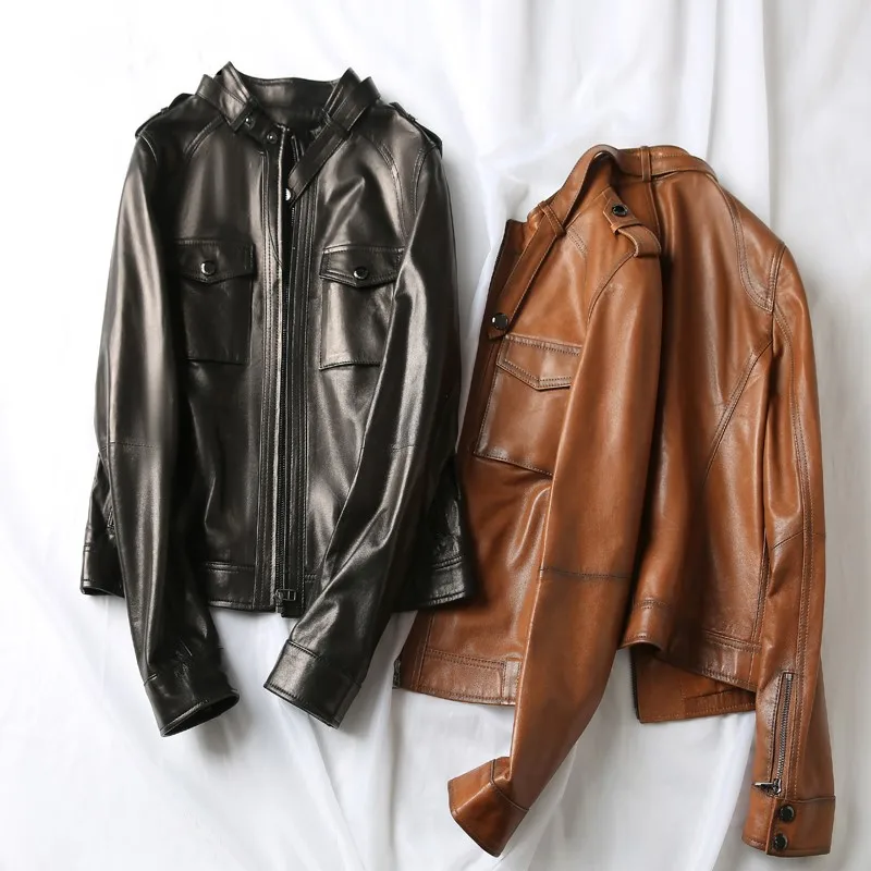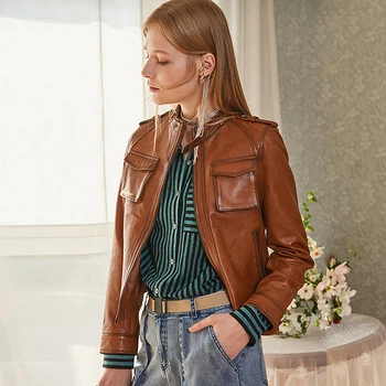 Special Offer سترة النساء 100% المدبوغة جلد الغنم 2 ألوان معطف جلد سستة طويلة الأكمام جيوب سترة تصميم كلاسيكي موضة جديدة Discount 35% Today!