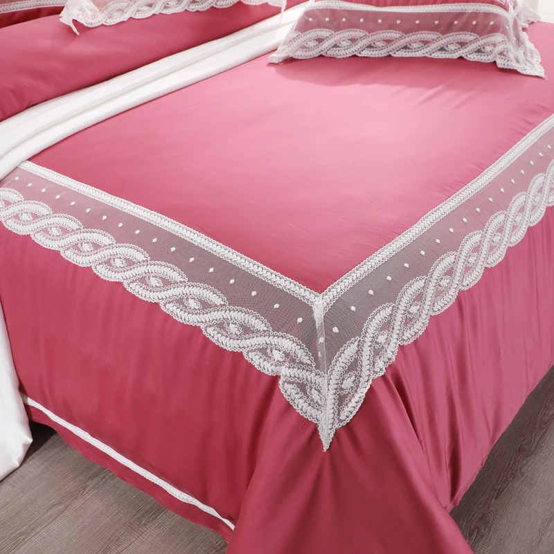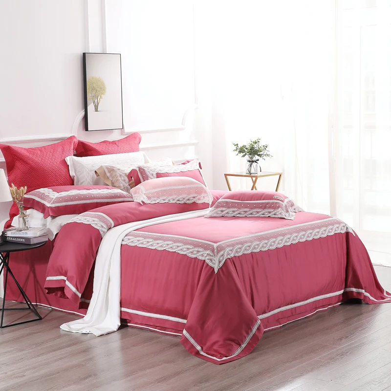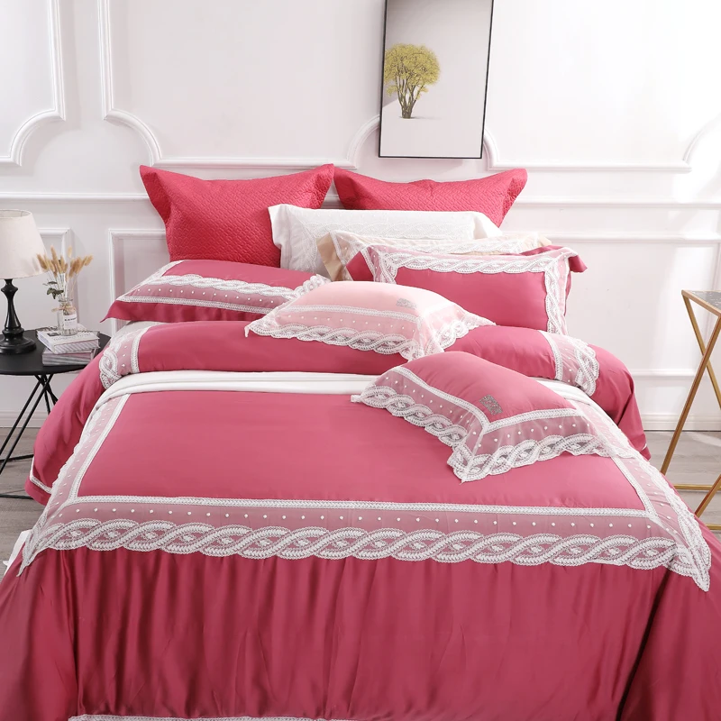 Special Offer الفاخرة الأحمر الدانتيل تصميم الفراش مجموعات لينة تنفس 100% ايوسل Lyocell 4 قطعة حاف مجموعة غطاء الملكة الملك الحجم الأميرة نمط Discount 0% Today!