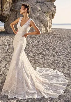 Special Offer 2019 مثير الخامس الرقبة غمد فستان الزفاف ذيل طويل أكمام فستان زفاف البوق الدانتيل يزين سستة الظهر سليم نمط HA029 Discount 0% Today!