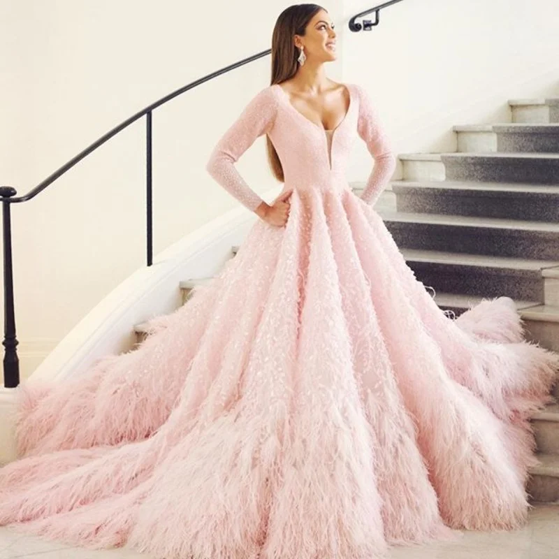 Special Offer فساتين لحضور الحفلات الموسيقية الفاخرة باللون الوردي 2019 بأكمام طويلة من الريش المزركش فساتين سهرة رسمية برقبة واسعة دانتيل مطرزة من Vestidos De ... Discount 0% Today!