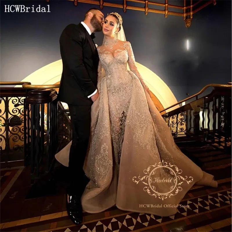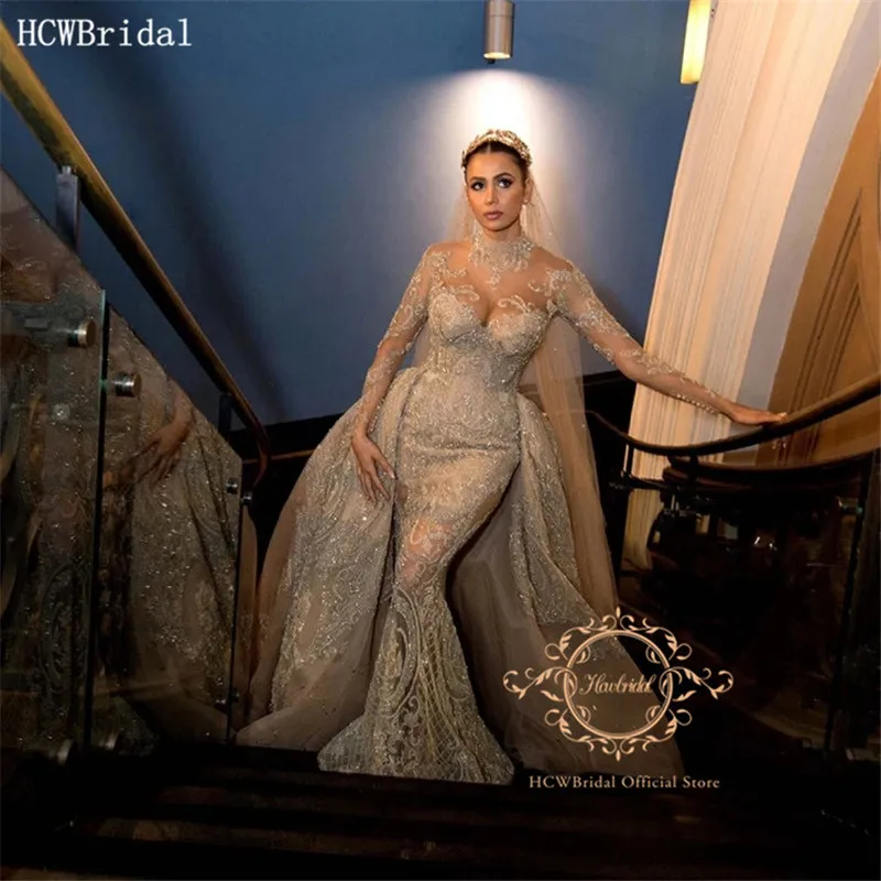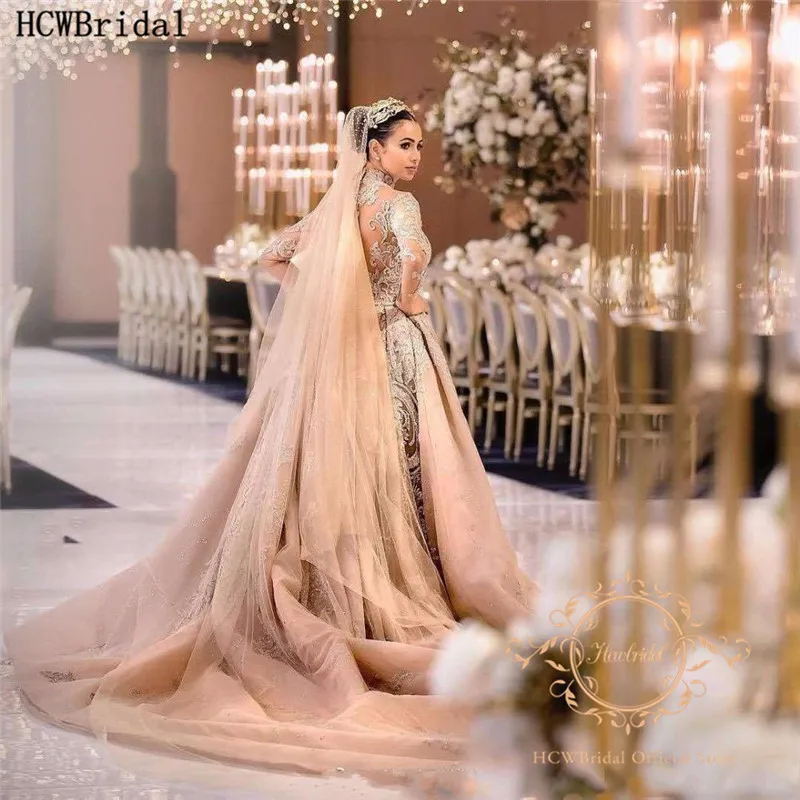 Special Offer فستان زفاف فاخر بتصميم حورية البحر باللون الشامبانيا في دبي ذو رقبة عالية وأكمام طويلة فساتين زفاف عربية إسلامية مصنوعة حسب الطلب Discount 34% Today!