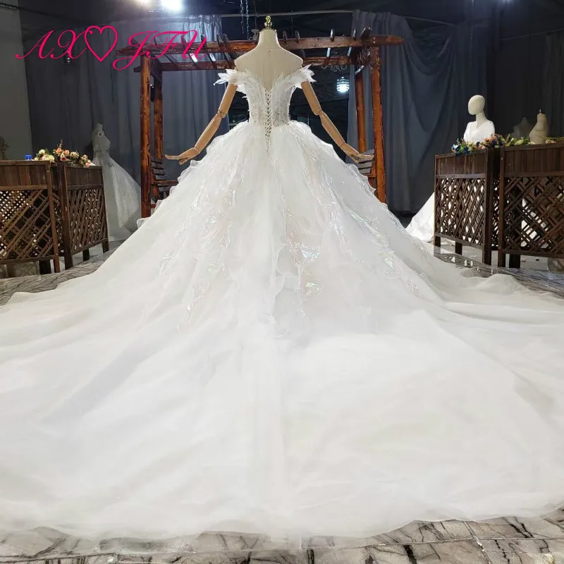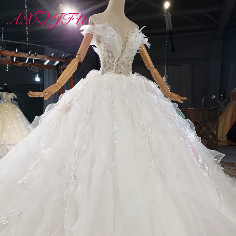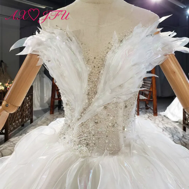 Special Offer AXJFU الفاخرة الأميرة الدانتيل الأبيض ريشة س الرقبة الوهم الخرز الكريستال سباركلي الكشكشة فستان الزفاف 100% صور حقيقية 1699 Discount 50% Today!