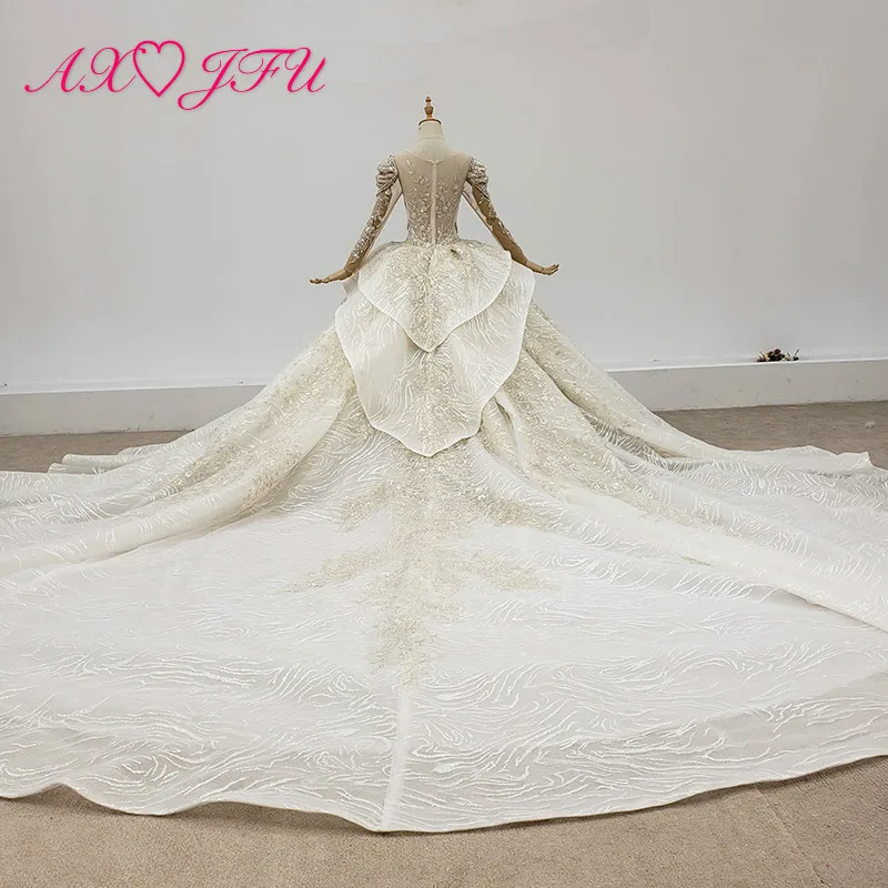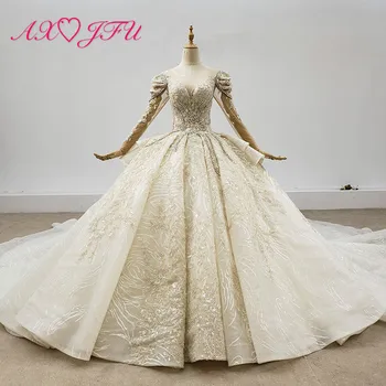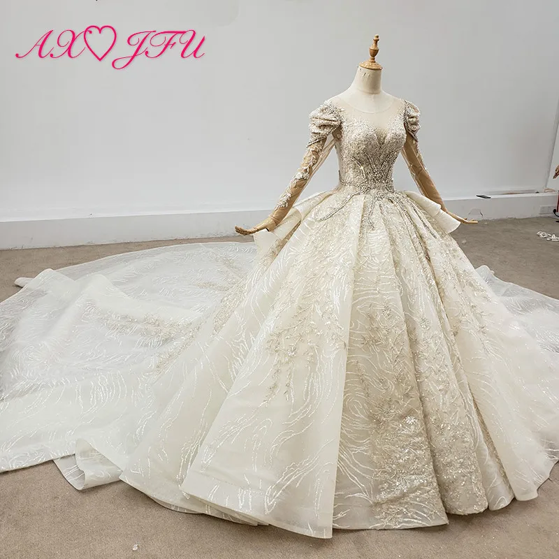 Special Offer AXJFU الفاخرة الأميرة سباركلي الخرز كريستال الوهم اليدوية س الرقبة طويلة الأكمام الشمبانيا الدانتيل فستان الزفاف 100% صور حقيقية Discount 50% Today!