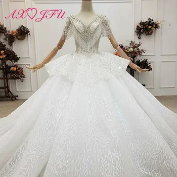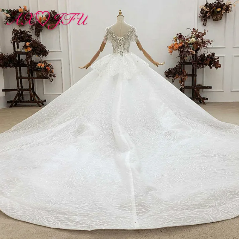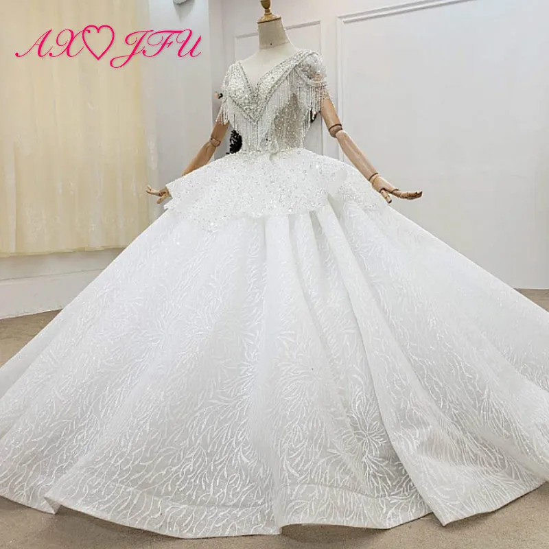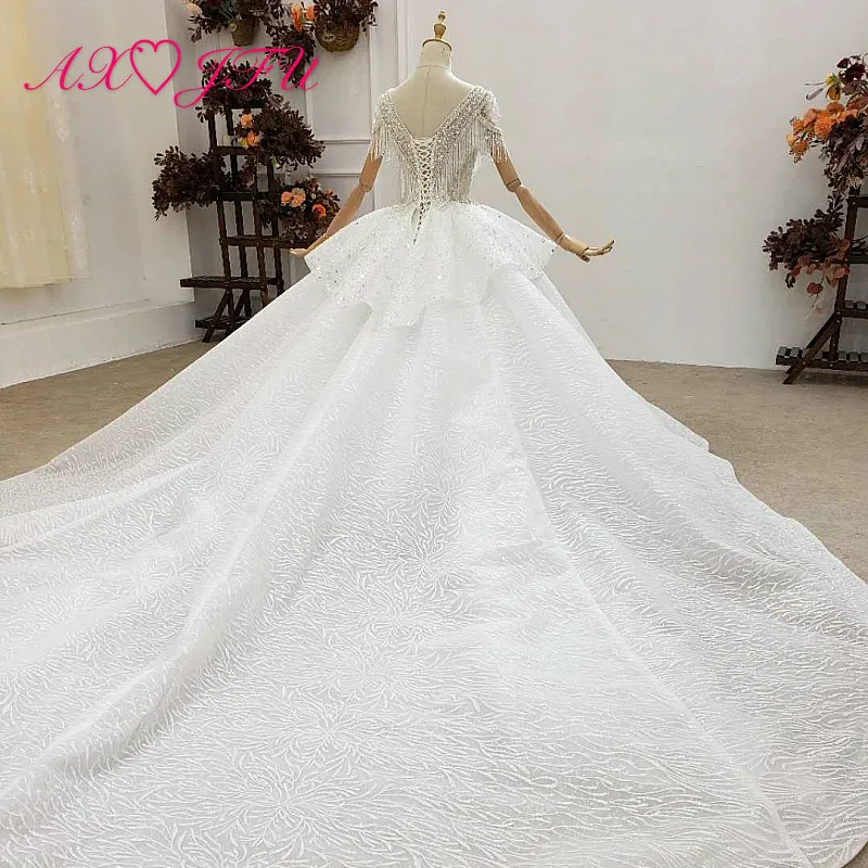 Special Offer AXJFU الفاخرة الأميرة الخرز اللؤلؤ الكريستال زهرة بيضاء الدانتيل اليدوية س الرقبة العروس قطار طويل الوهم فستان الزفاف 99948 Discount 50% Today!