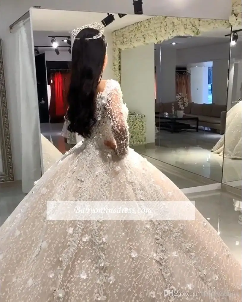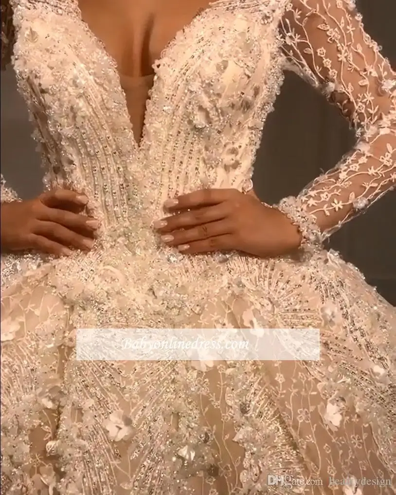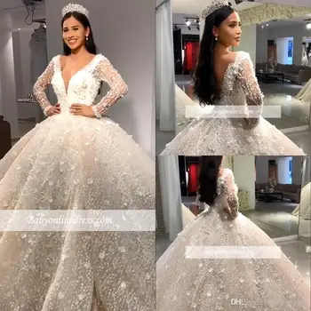 Special Offer فساتين زفاف فاخرة من الخرز على شكل كرة على شكل حرف V ترتر مطرز بالورود مزينة بزينة طويلة الأكمام فستان زفاف رداء De Mariee Discount 50% Today!