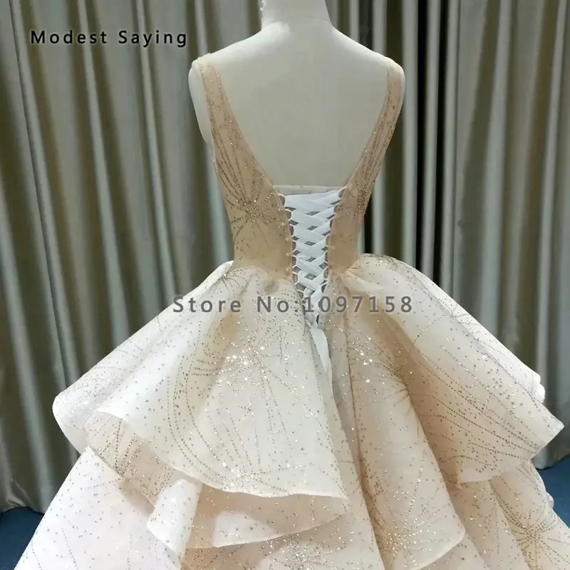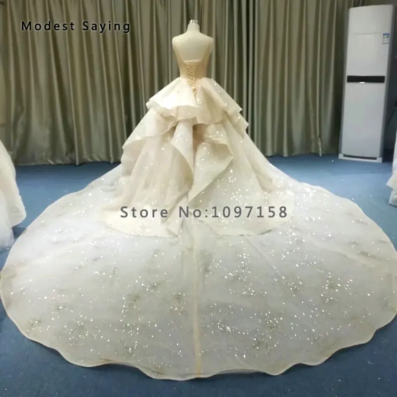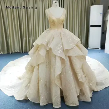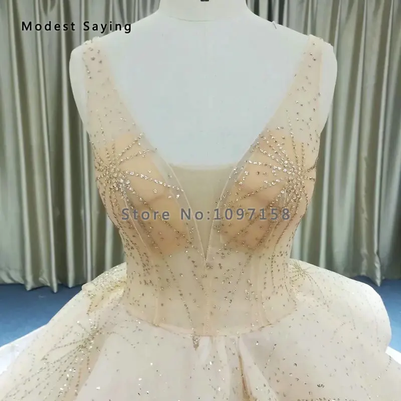 Special Offer فستان زفاف فاخر لحفلات الزفاف مزين بخرز لامع ومزين بالخرز 2019 مع ذيل كاتدرائي مثير شفاف وشامبانيا فستان زفاف مكشكش Discount 10% Today!