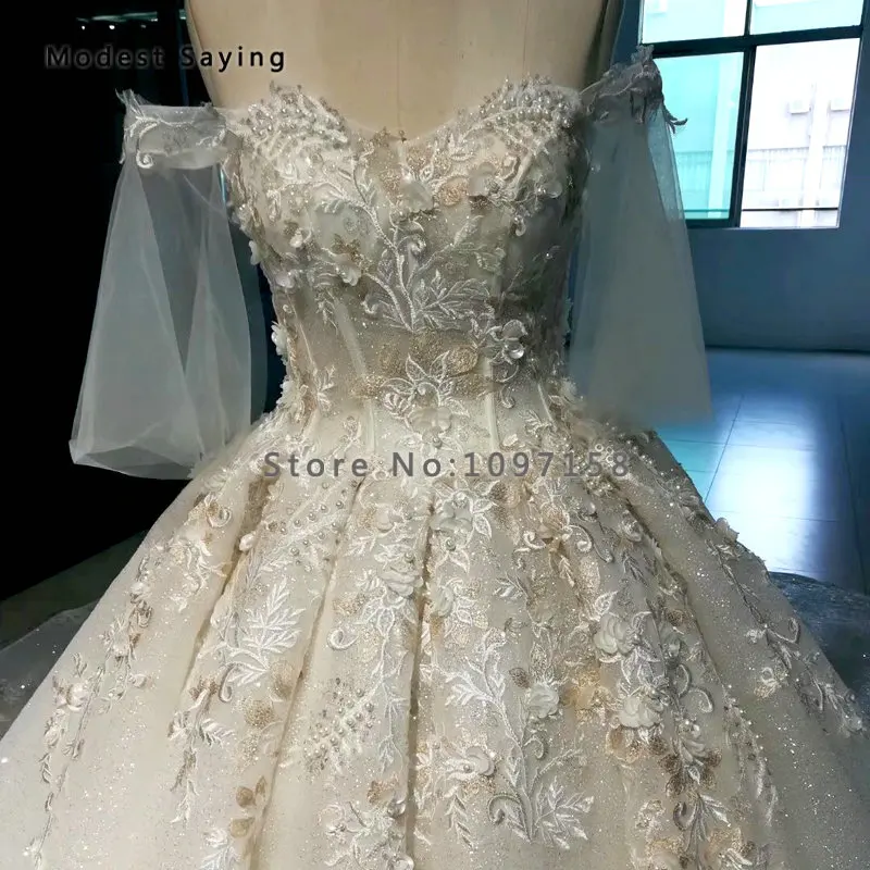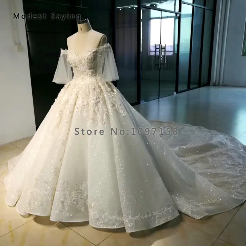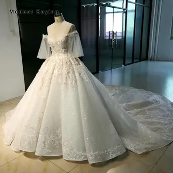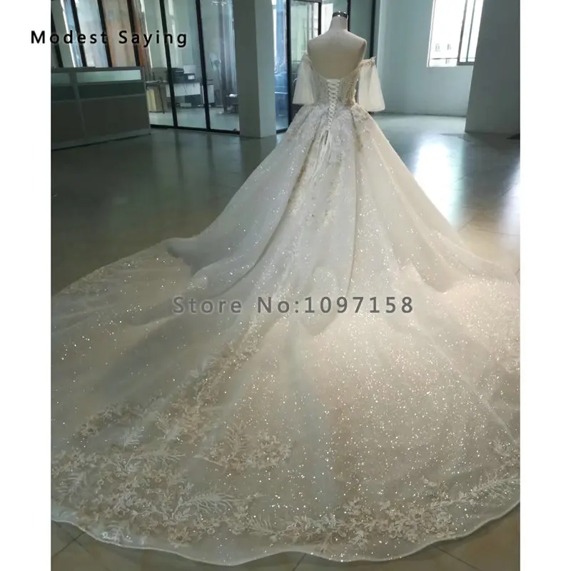 Special Offer الفاخرة العاج و الشمبانيا الكرة ثوب البريق مطرز الدانتيل فستان الزفاف 2019 كاتدرائية قطار نصف الأكمام الحبيب زي العرائس Discount 10% Today!