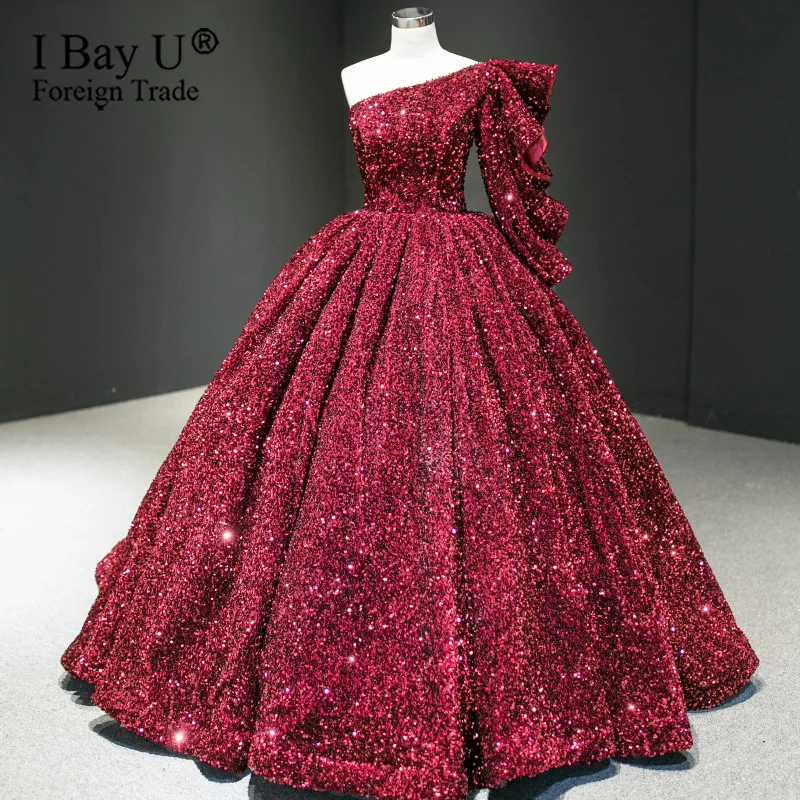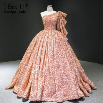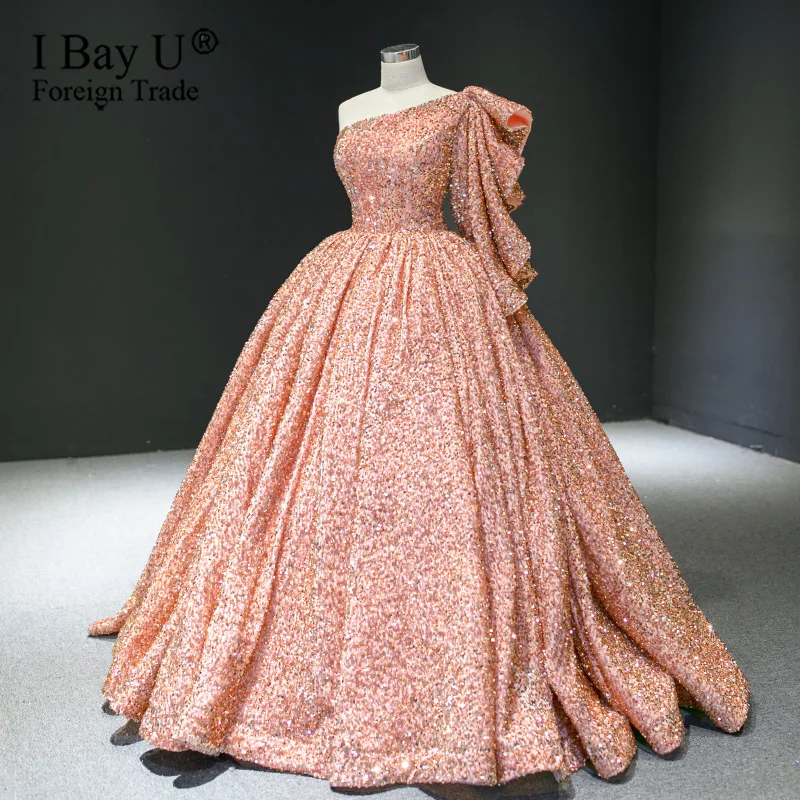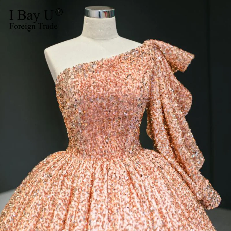Special Offer فستان زفاف مثير بأكمام واحدة 2020 فرنسا الحبيب مثير رداء دي ماري الشمبانيا الفاخرة التألق الترتر فستان الزفاف Discount 0% Today!