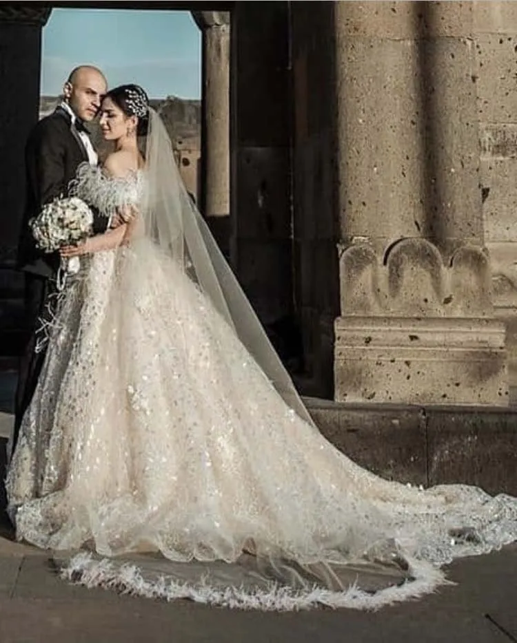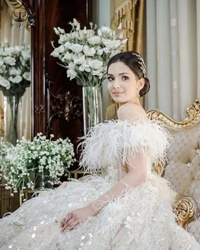 Special Offer 2020 رداء دي ماري بلينغ بلينغ قبالة الكتف كم قصير ألف خط الترتر الدانتيل ريشة الشمبانيا فساتين الزفاف Discount 0% Today!