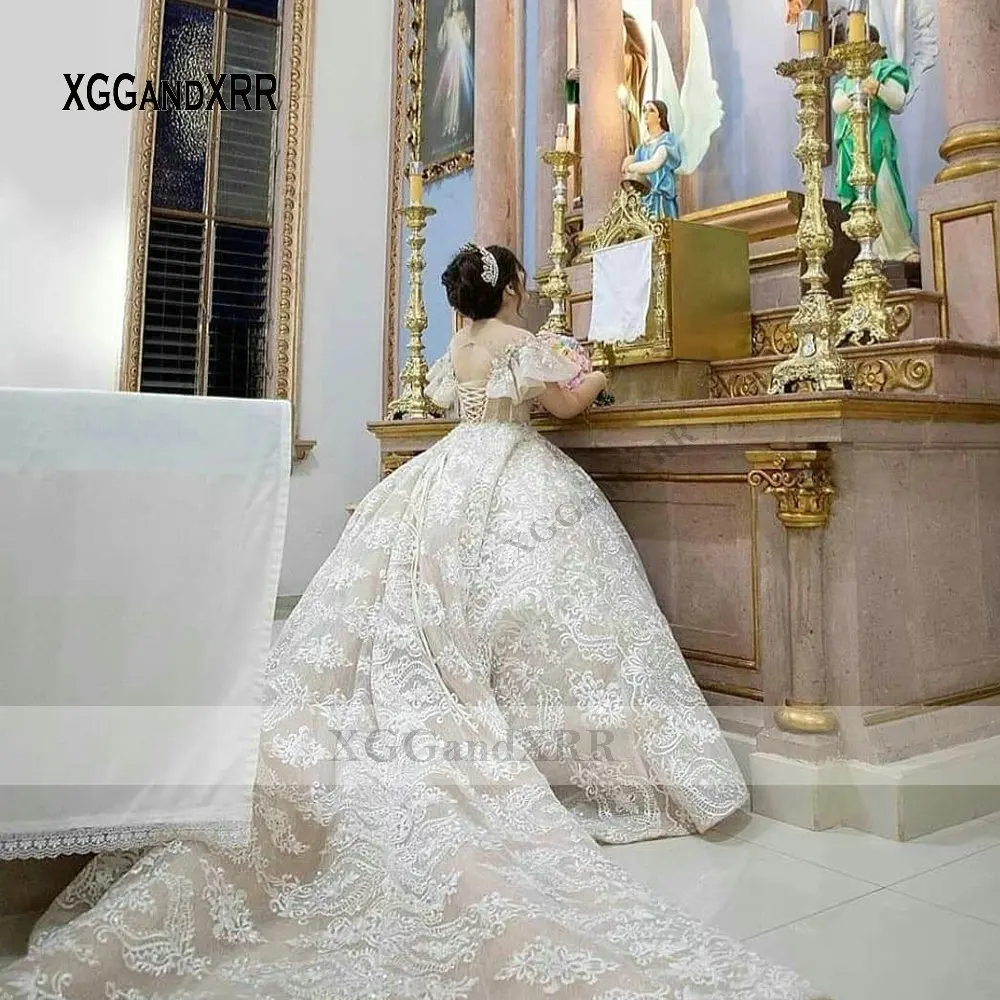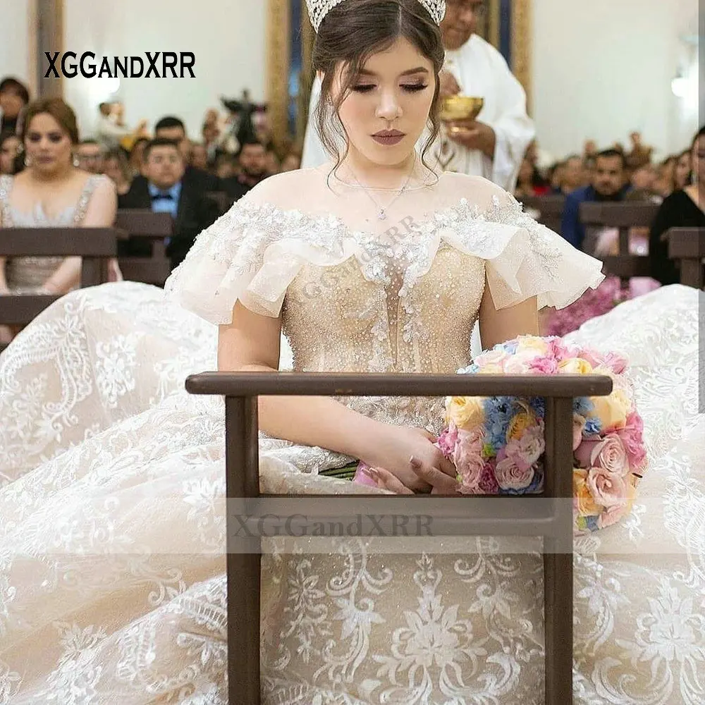 Special Offer فساتين أنيقة 2021 على شكل كرة شامبانيا من الدانتيل Quinceanera فاخرة ومزينة بالخرز وأكمام طويلة لحفلات التخرج Discount 20% Today!