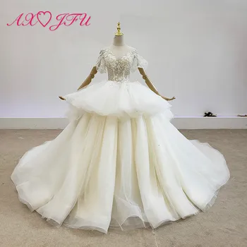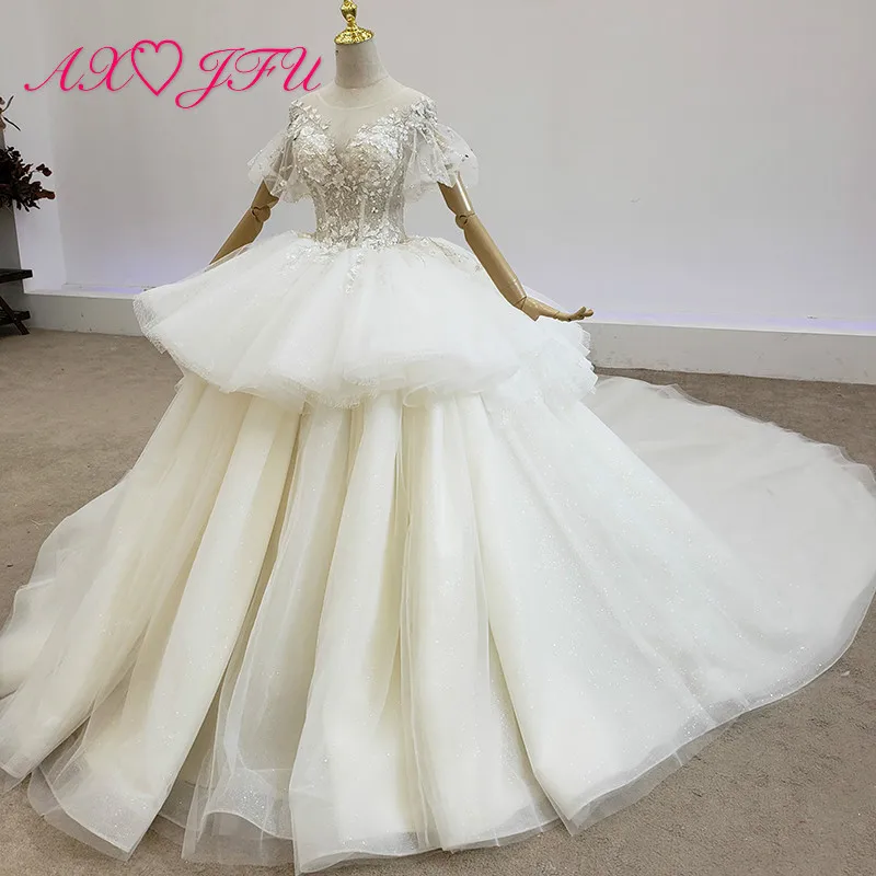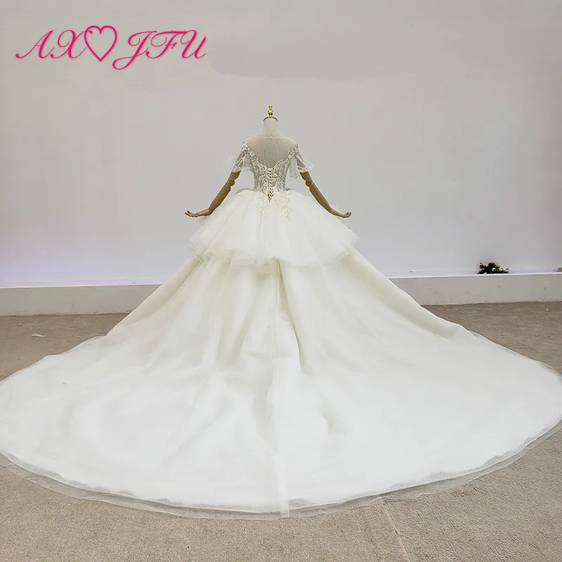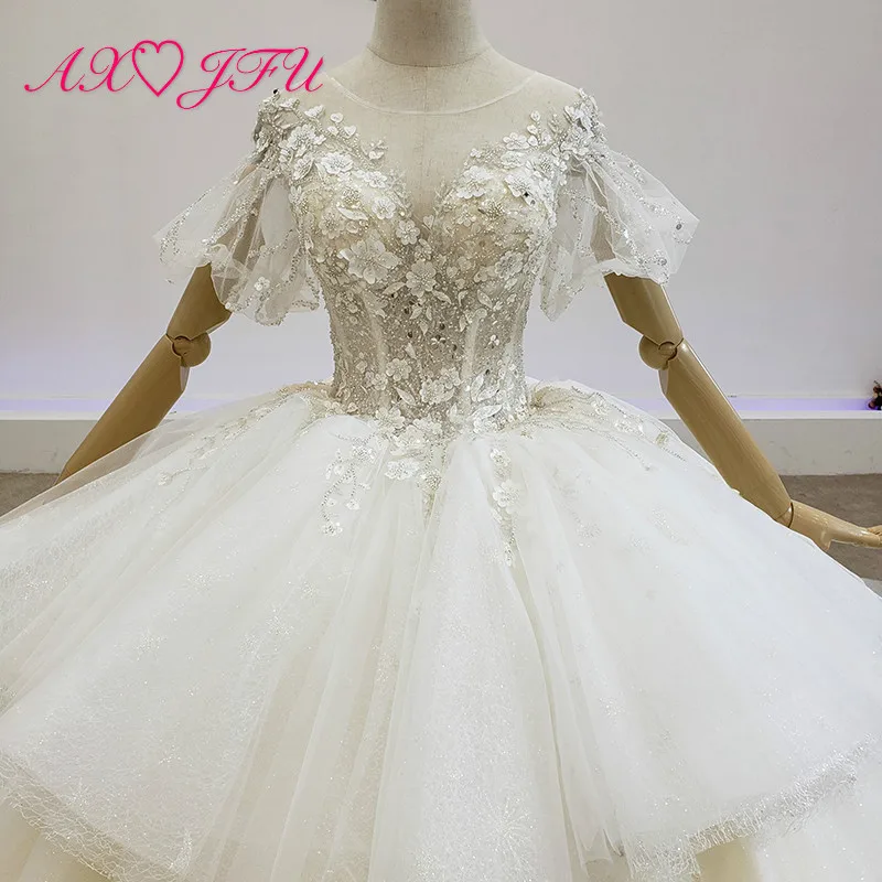 Special Offer AXJFU الفاخرة الأميرة سباركلي الخرز كريستال الوهم اليدوية س الرقبة الدانتيل الأبيض نفخة كم فستان الزفاف 100% صور حقيقية Discount 50% Today!