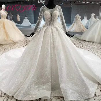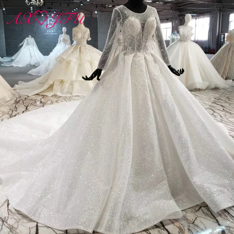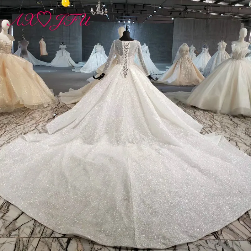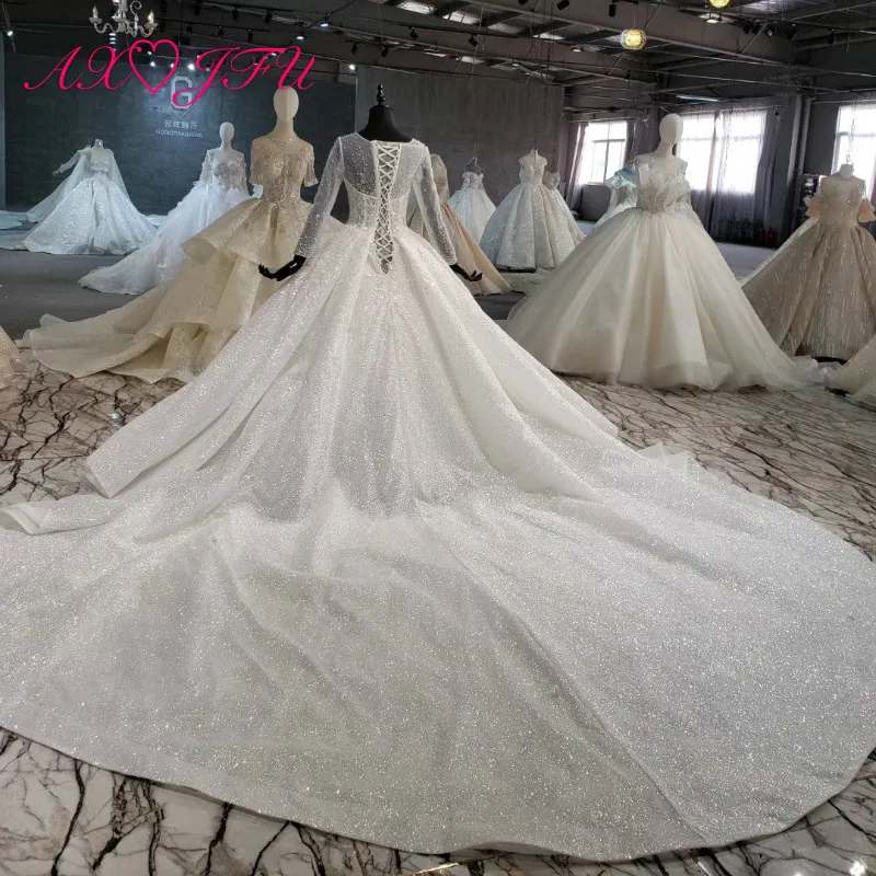 Special Offer AXJFU الفاخرة الأميرة الدانتيل الأبيض س الرقبة العروس طويلة الأكمام الترتر الخرز زهرة الكريستال سباركلي الشمبانيا فستان الزفاف 1100 Discount 50% Today!