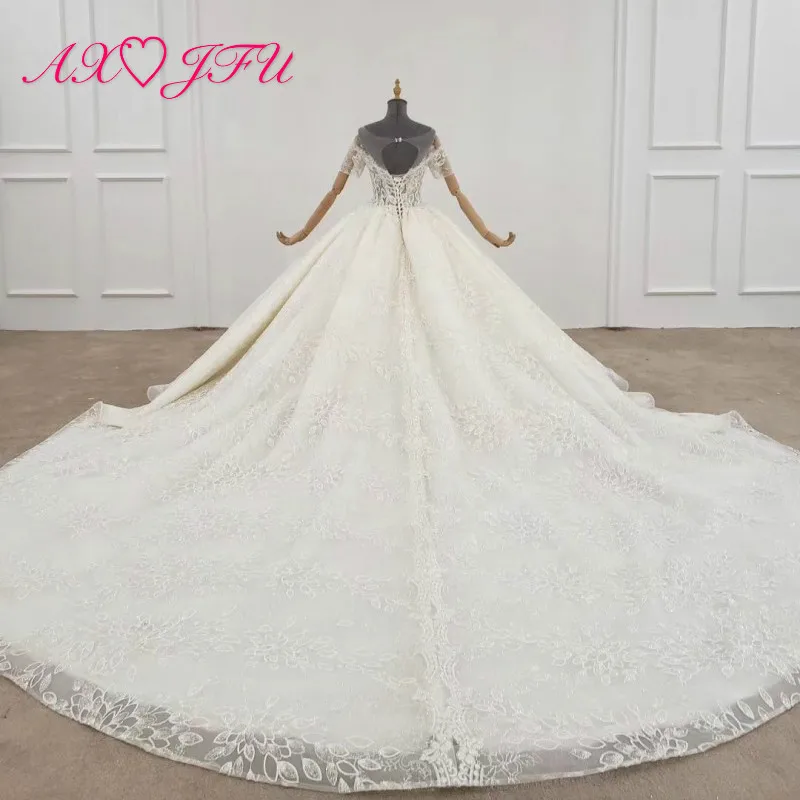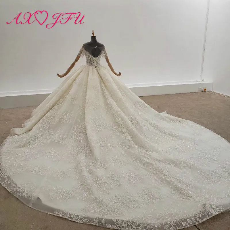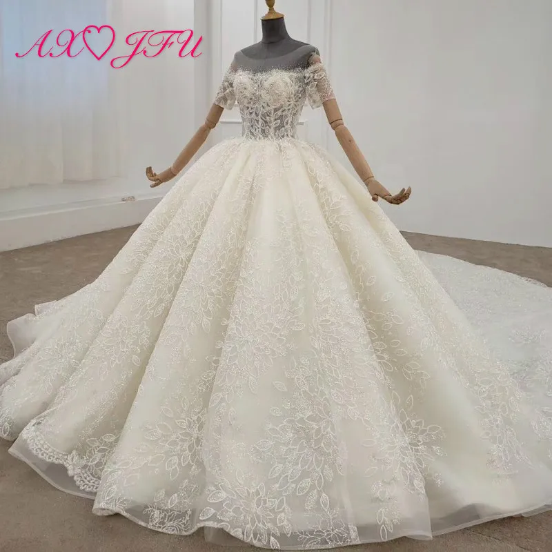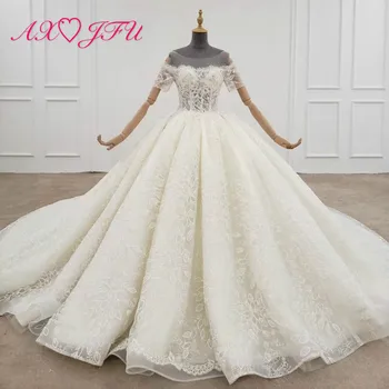 Special Offer AXJFU الفاخرة الأميرة الديكور زهرة الكريستال الدانتيل الأبيض اليدوية س الرقبة قصيرة الأكمام العروس الشمبانيا الوهم الزفاف Dress99465 Discount 50% Today!