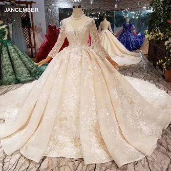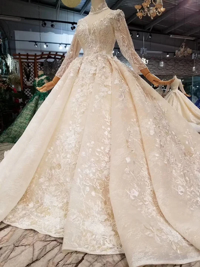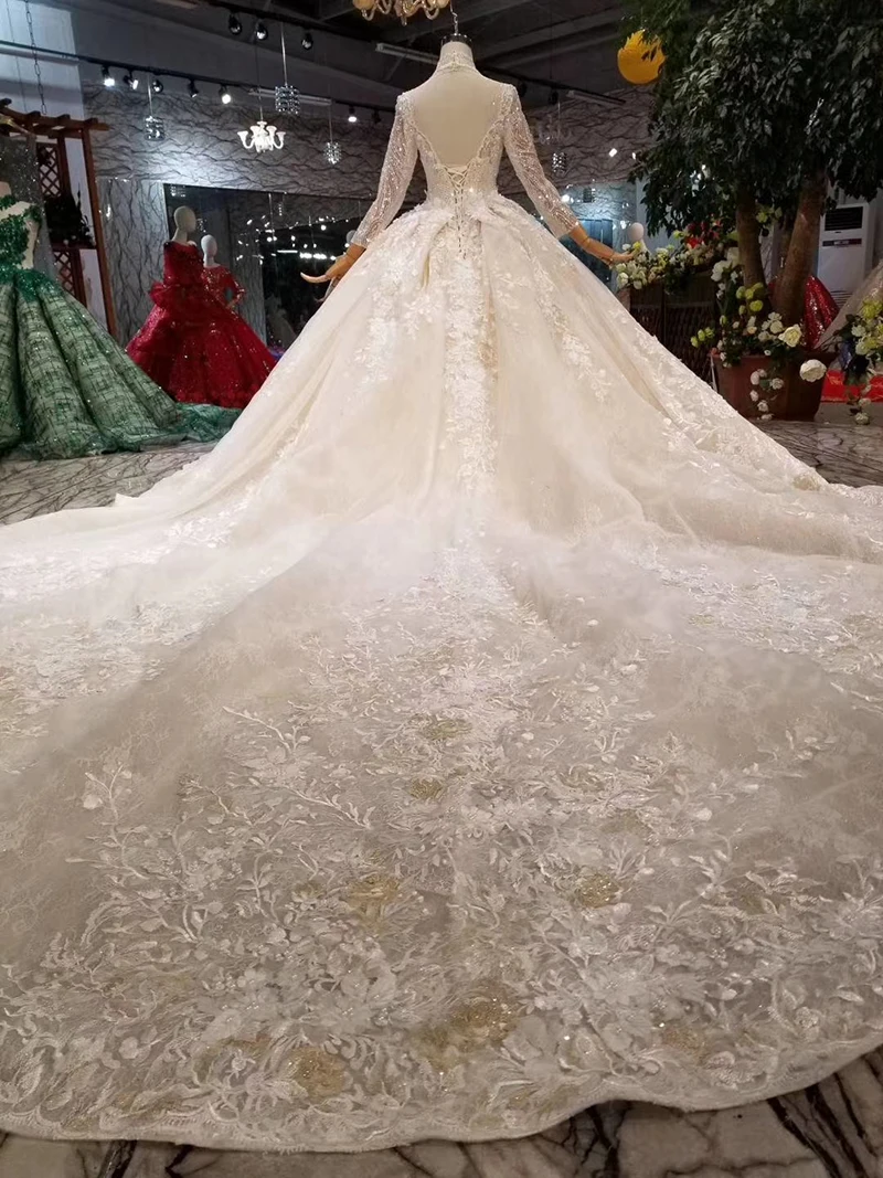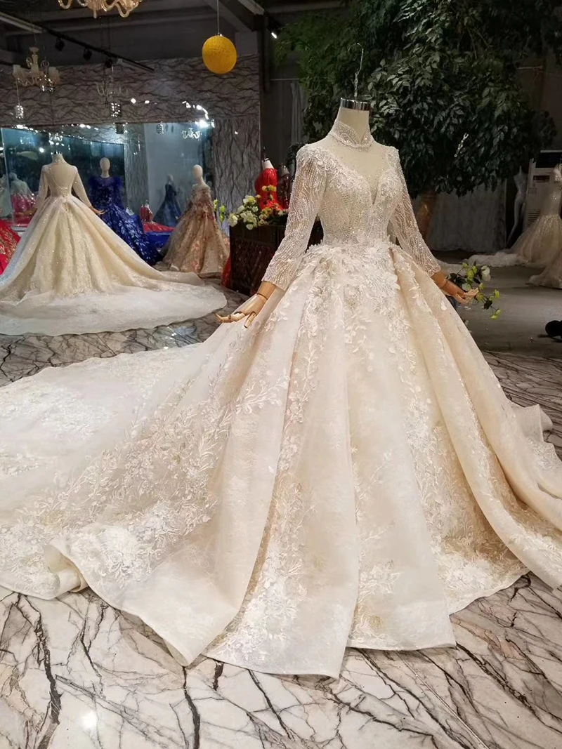 Special Offer LSS445 الفاخرة فساتين الزفاف عالية الرقبة طويلة تول الأكمام مطرز أثواب الزفاف 2019 زهرة قطار طويل الزفاف اللباس Abito Sposa Discount 50% Today!