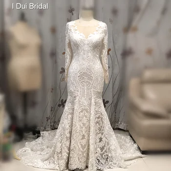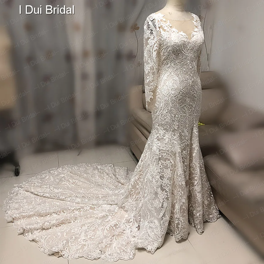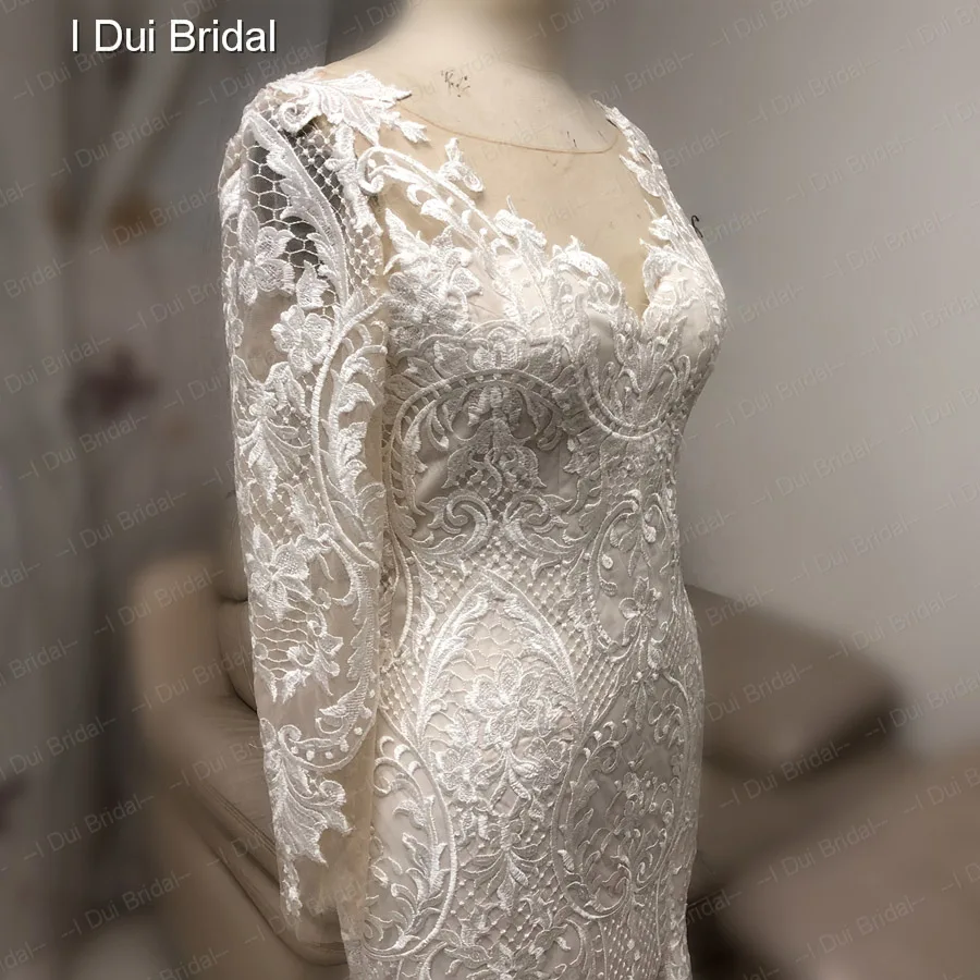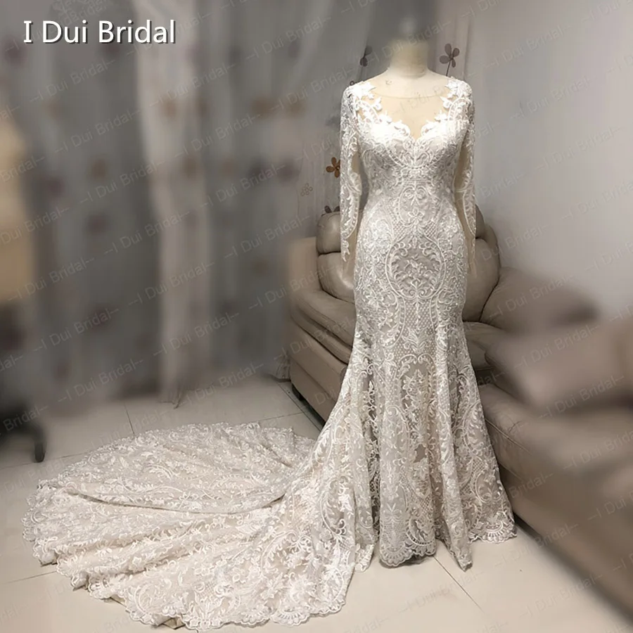 Special Offer فاخر الدانتيل حورية البحر فستان الزفاف كم طويل الوهم العنق فستان زفاف نمط جديد Discount 0% Today!
