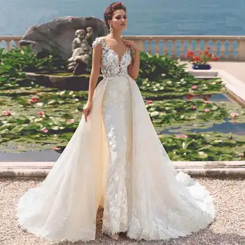Special Offer فاخر كامل الدانتيل حورية البحر فستان الزفاف مع ذيل قابل للانفصال أنيقة مغرفة الرقبة يزين خمر زي العرائس الزفاف Discount 0% Today!