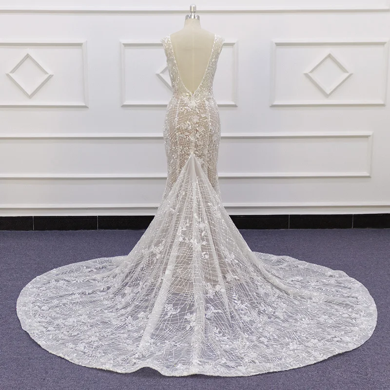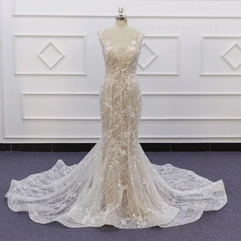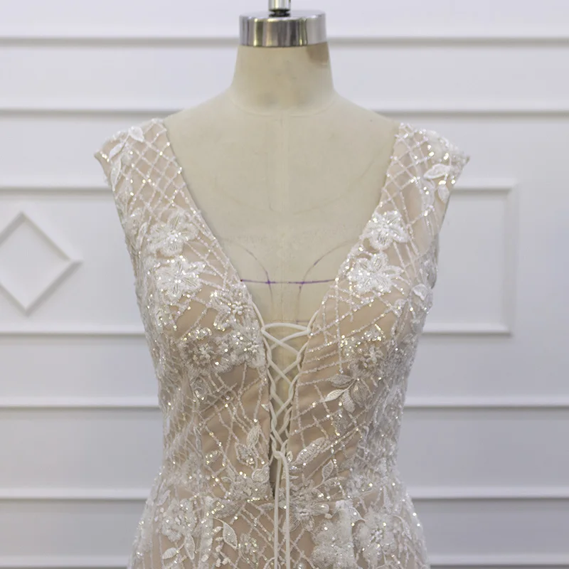 Special Offer 2020 فستان زفاف لامعة الترتر الدانتيل الخامس الرقبة الشمبانيا العميق الخامس الظهر مع سحاب مخصص فساتين الزفاف 19001 Discount 0% Today!
