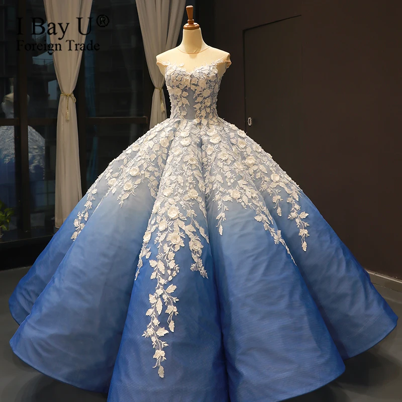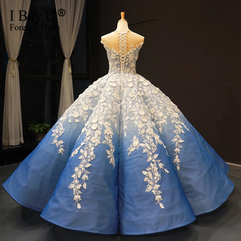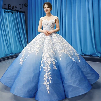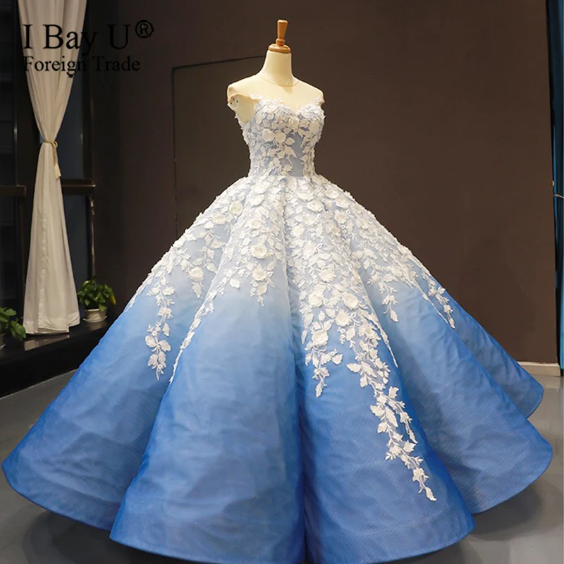 Special Offer فاخر الأزرق الداكن أحدث تصميم فساتين الزفاف 2020 ثلاثية الأبعاد الدانتيل منتفخ الطيات مثير زي العرائس Discount 0% Today!