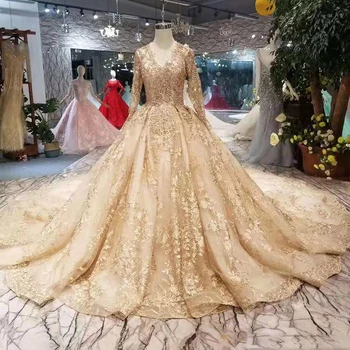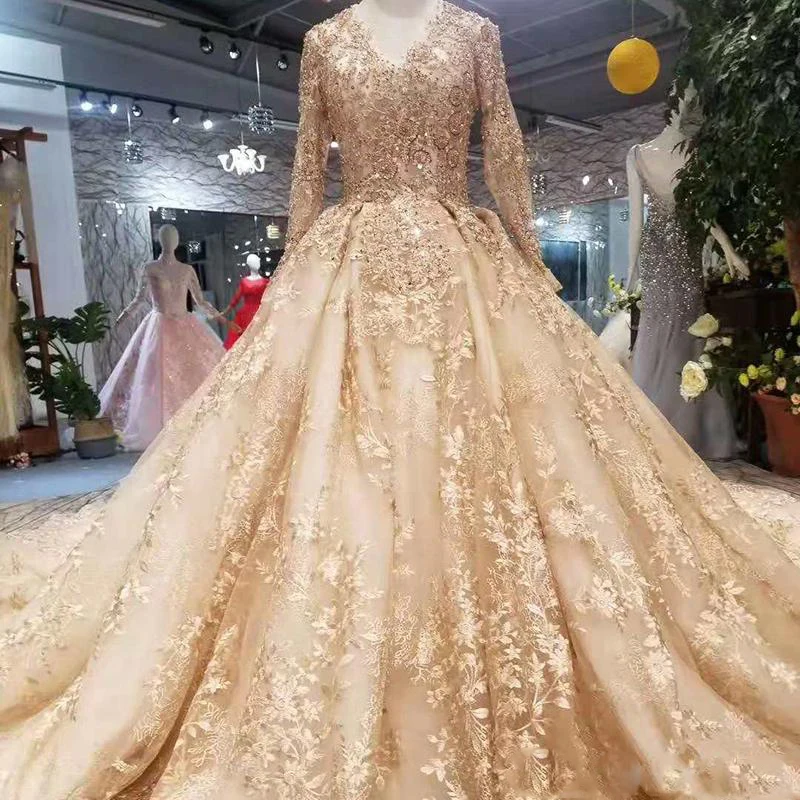 Special Offer ذهبي دانتيل فساتين الزفاف 2021 أحدث تصميم رقبة V كم طويل دانتيل الظهر فستان زفاف فاخر مع قطار ملكي لامع Discount 10% Today!