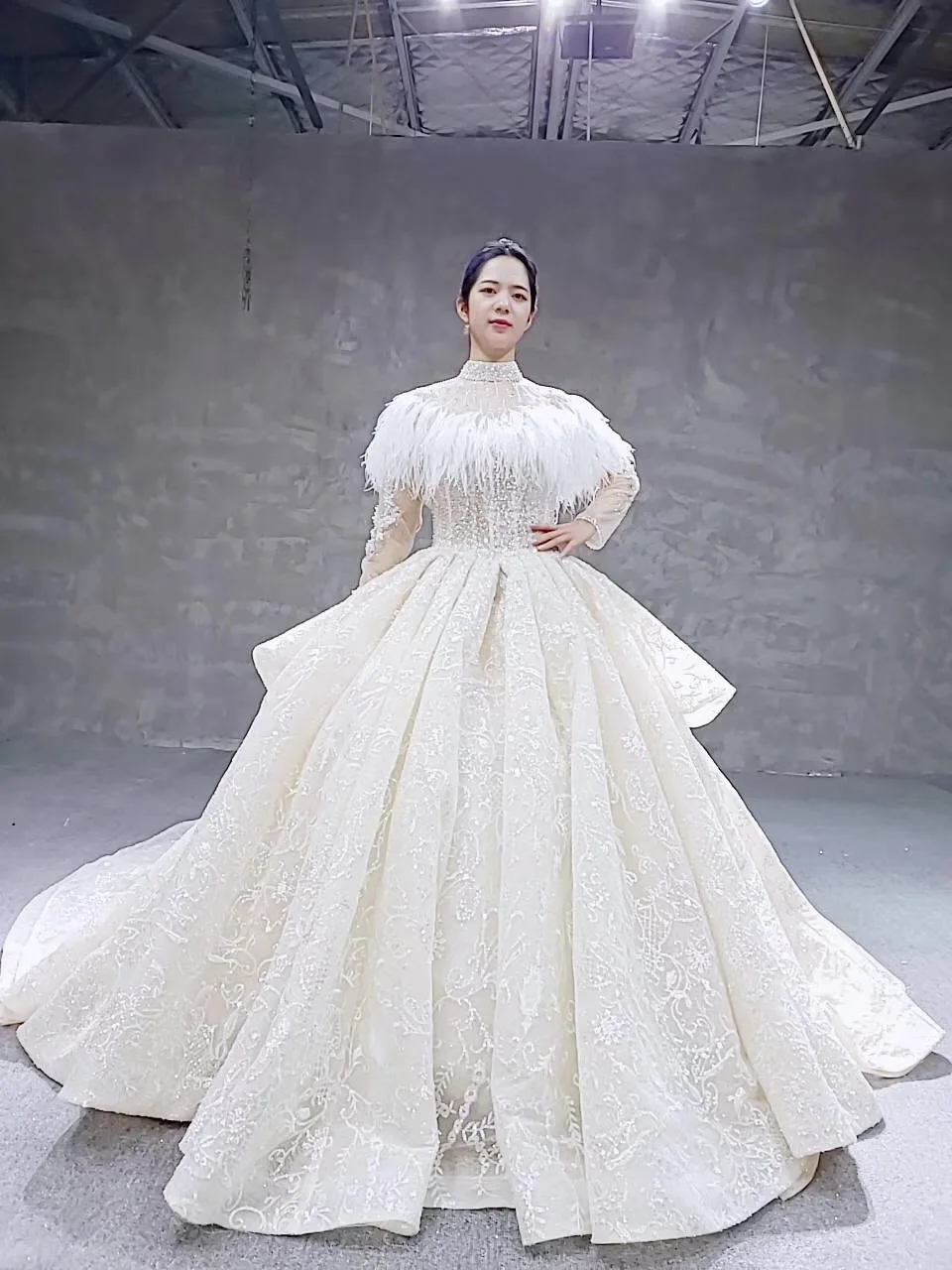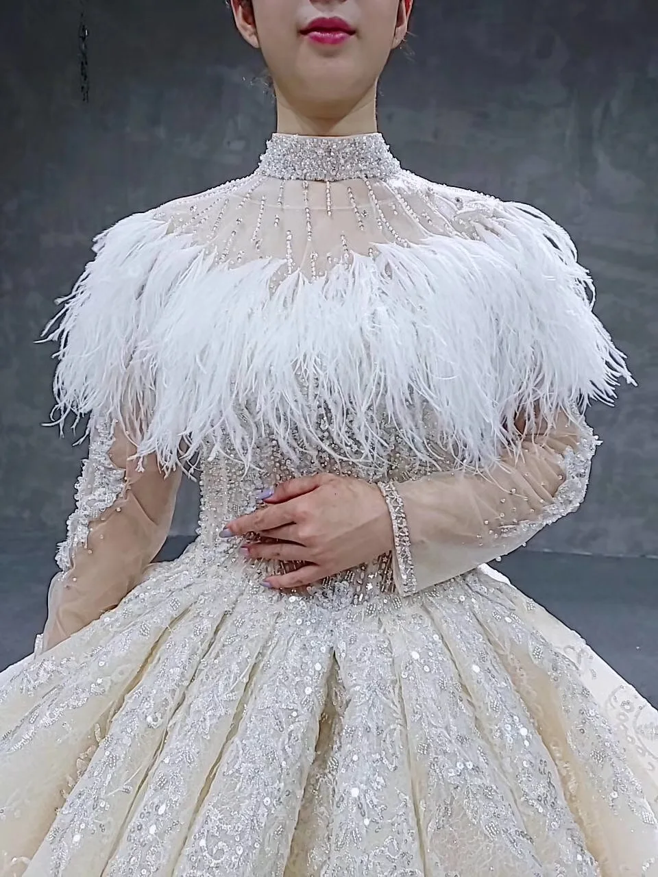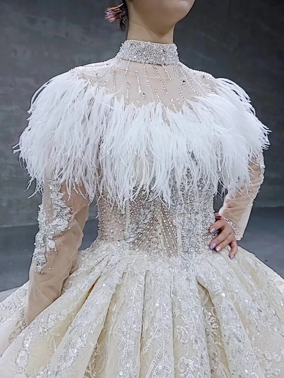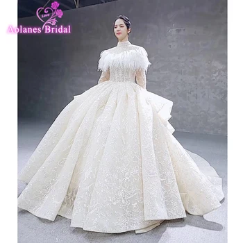 Special Offer فساتين زفاف خاصة مع ريشة الرأس س الرقبة طويلة تول كم مطرز ثوب زفاف فاخر اليد العمل فستان الزفاف Discount 24% Today!