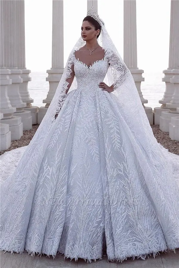 Special Offer رائعة دبي الدانتيل الخرز الكرة ثوب الزفاف الفاخرة يترك نمط الزفاف زي العرائس مثير الخامس الرقبة فساتين زفاف Discount 30% Today!