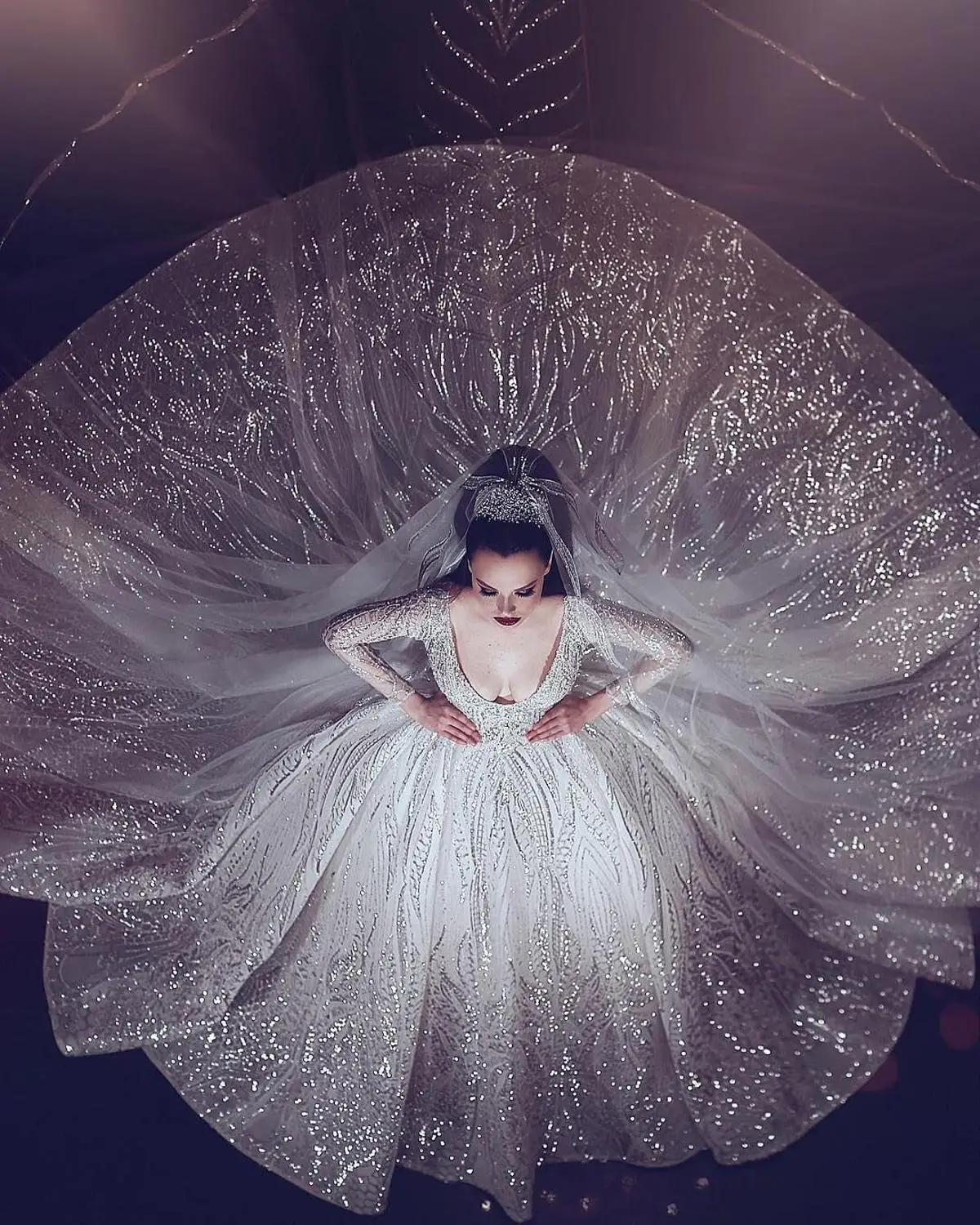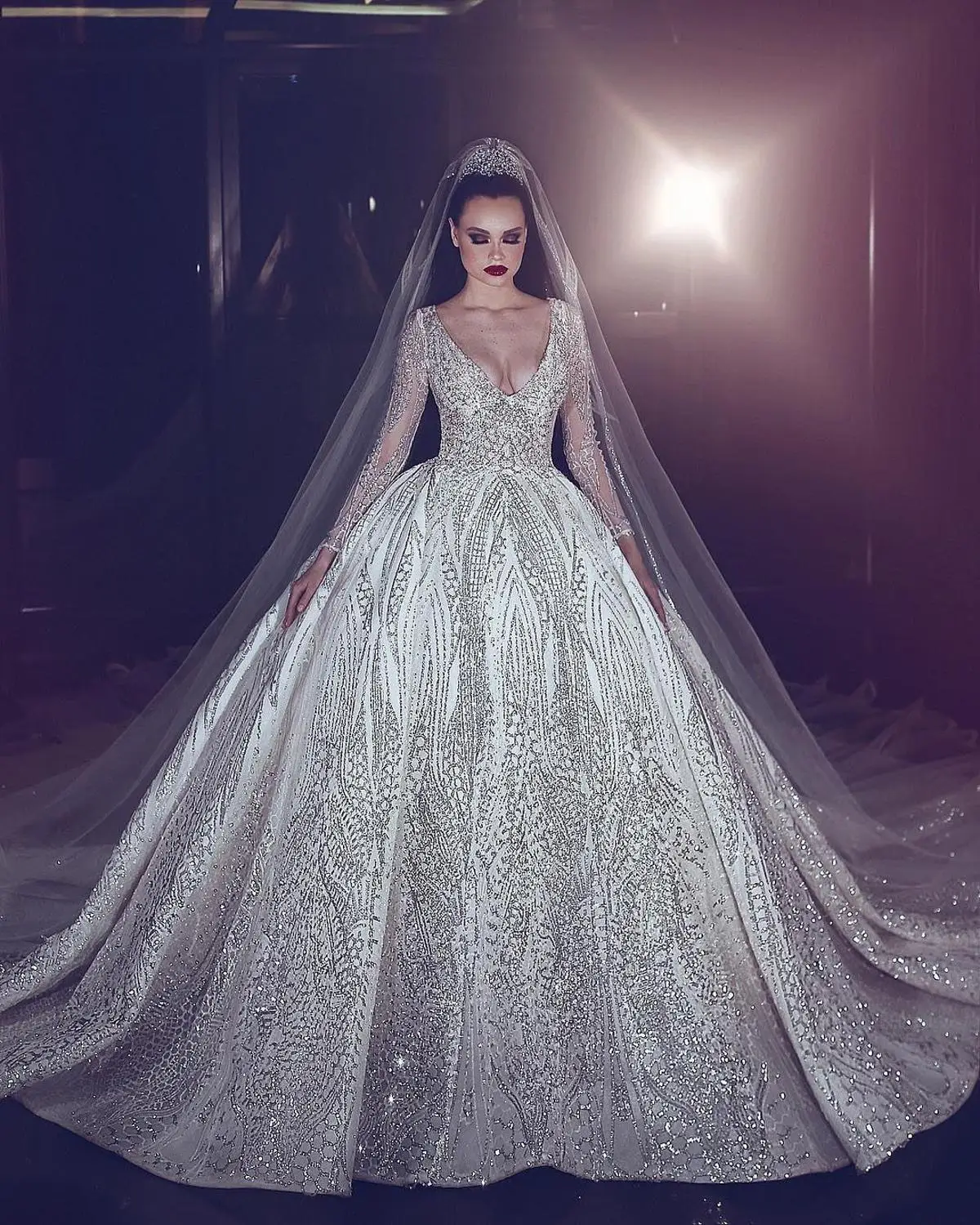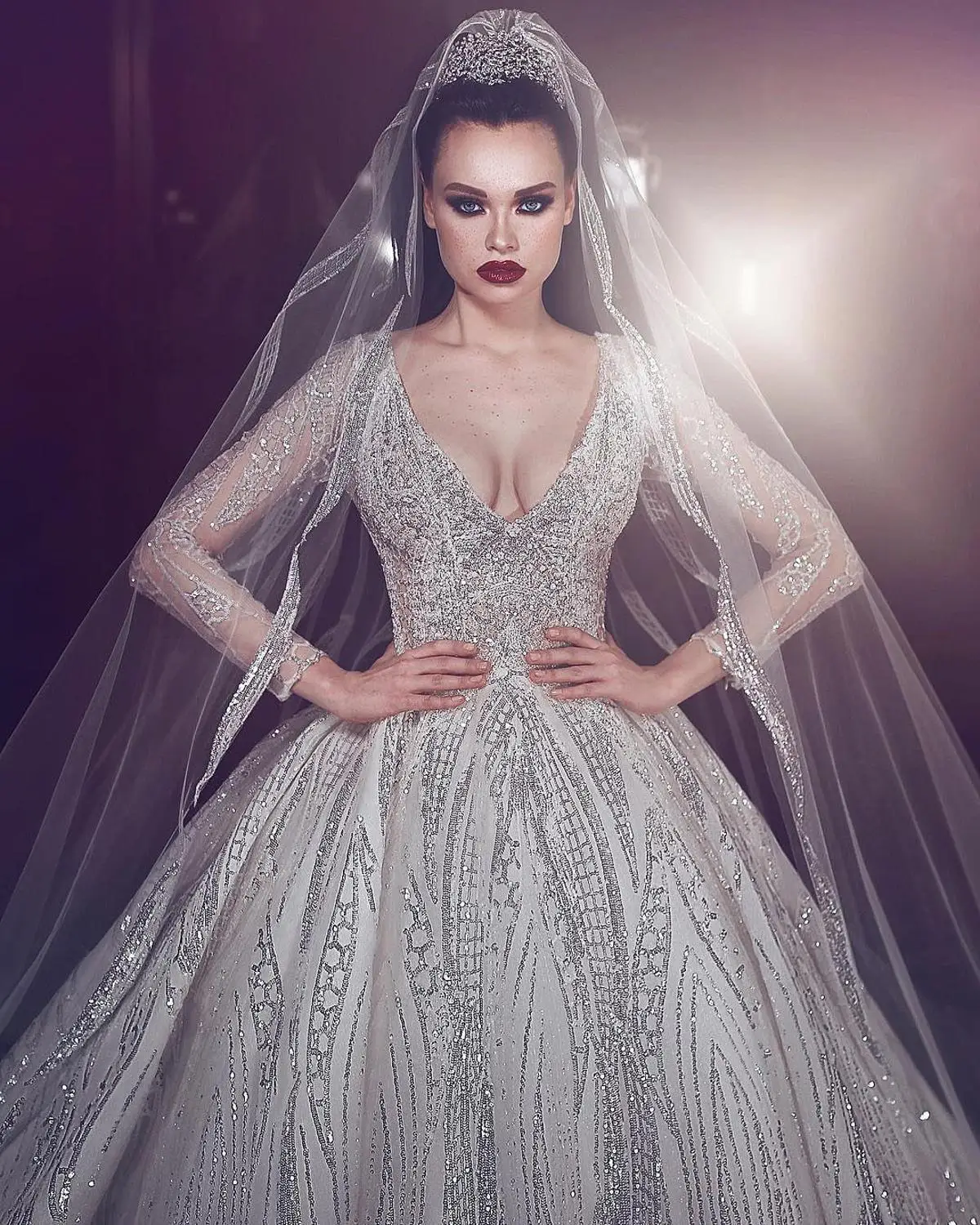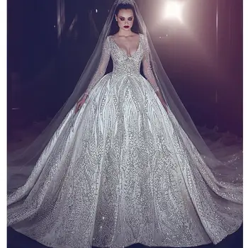 Special Offer خمر فستان الزفاف الفاخرة الديكور الأميرة الوهم ثوب زفاف طويل الأكمام مثير العميق الخامس الرقبة الكرة ثوب فساتين زفاف Discount 30% Today!