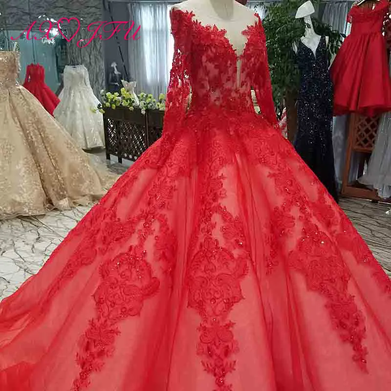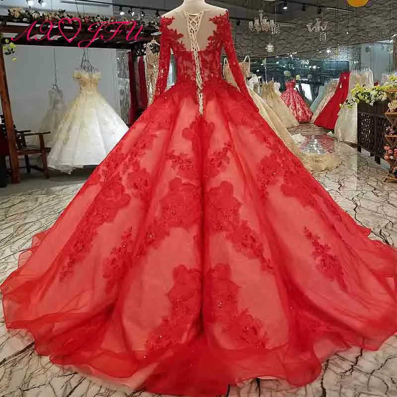 Special Offer AXJFU الفاخرة الأميرة الخرز الكريستال الأحمر الدانتيل س الرقبة العروس سباركلي الوهم العروس زهرة زهرة طويلة الأكمام فستان الزفاف 0014 Discount 50% Today!