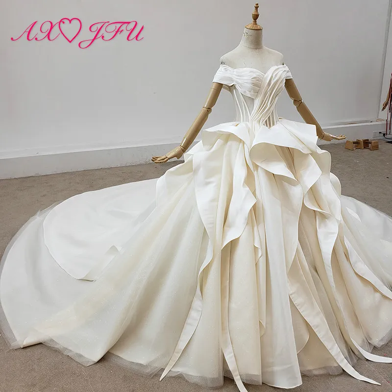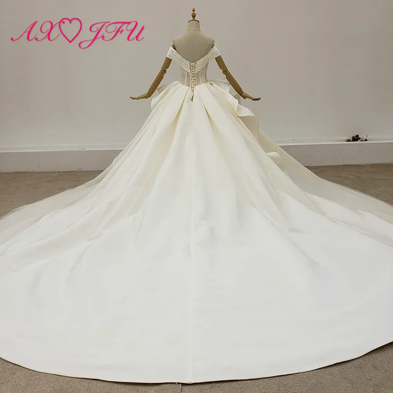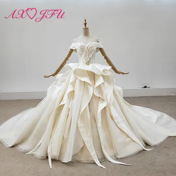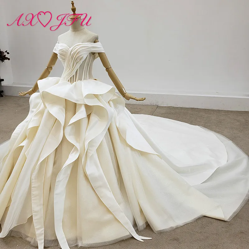 Special Offer AXJFU الفاخرة الأميرة العروس الخرز كريستال الكرة ثوب اليدوية قارب الرقبة الكشكشة الأبيض الدانتيل فستان الزفاف 100% صور حقيقية Discount 50% Today!
