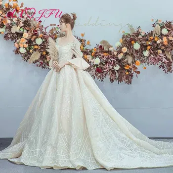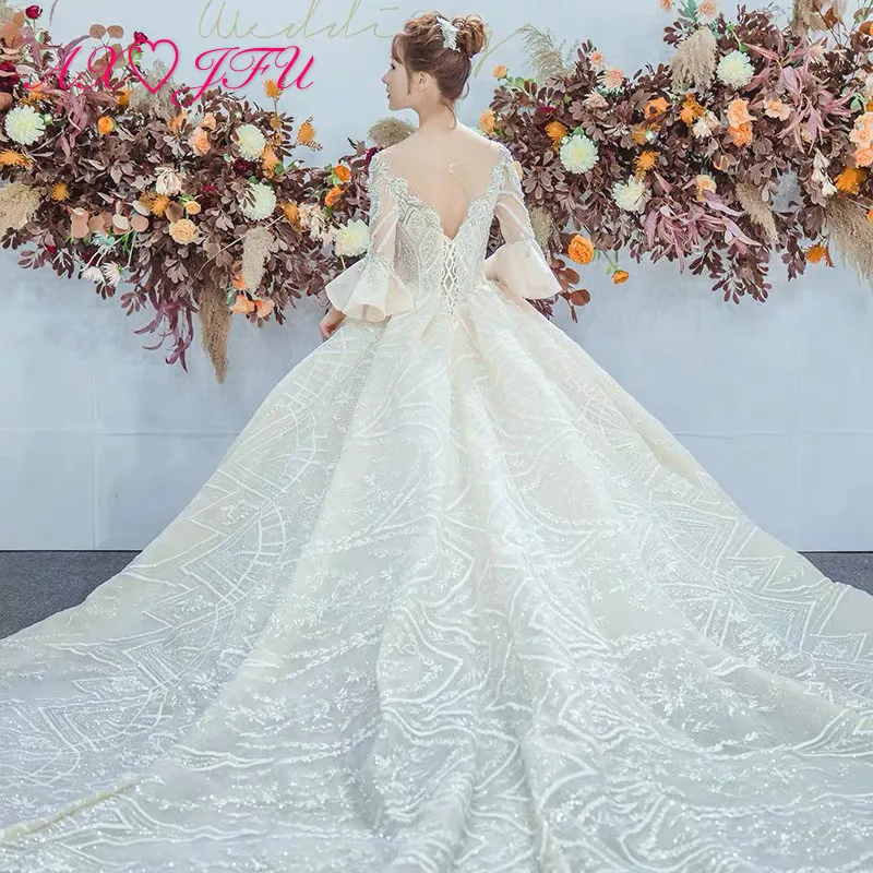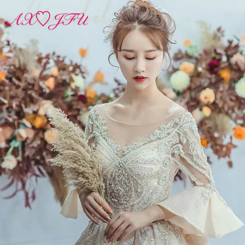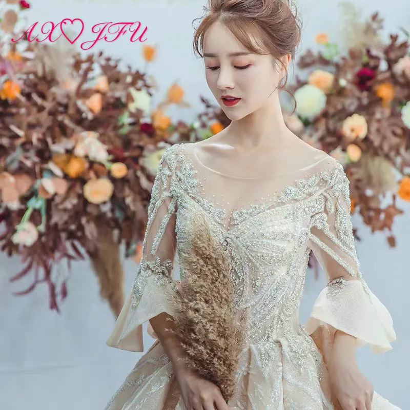 Special Offer AXJFU الفاخرة الأميرة الخرز الكريستال زهرة بيضاء الدانتيل س الرقبة مضيئة الأكمام الوهم العروس الشمبانيا الكشكشة فستان الزفاف Discount 50% Today!
