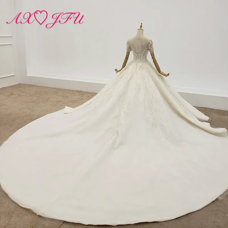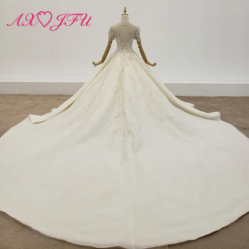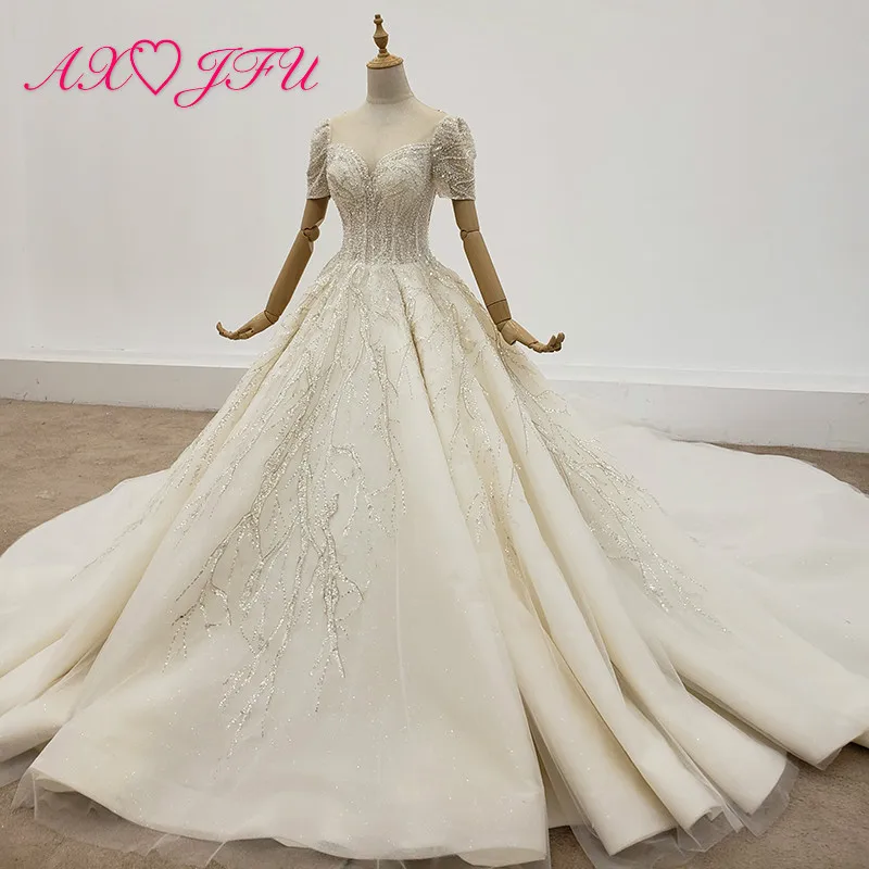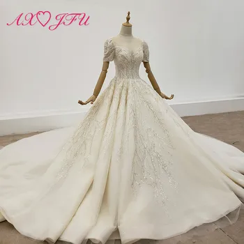 Special Offer AXJFU الفاخرة الأميرة الخرز زهرة الكريستال الدانتيل اليدوية س الرقبة طويلة الوهم قصيرة الأكمام العروس الزفاف Dress100 ٪ صور حقيقية Discount 50% Today!