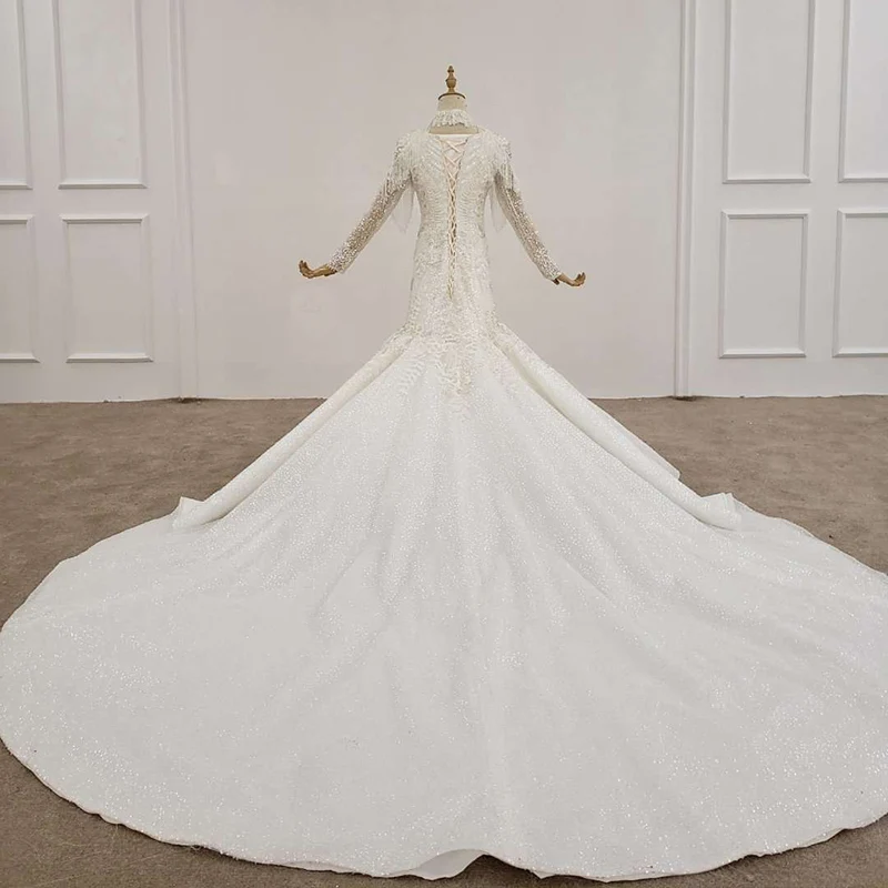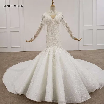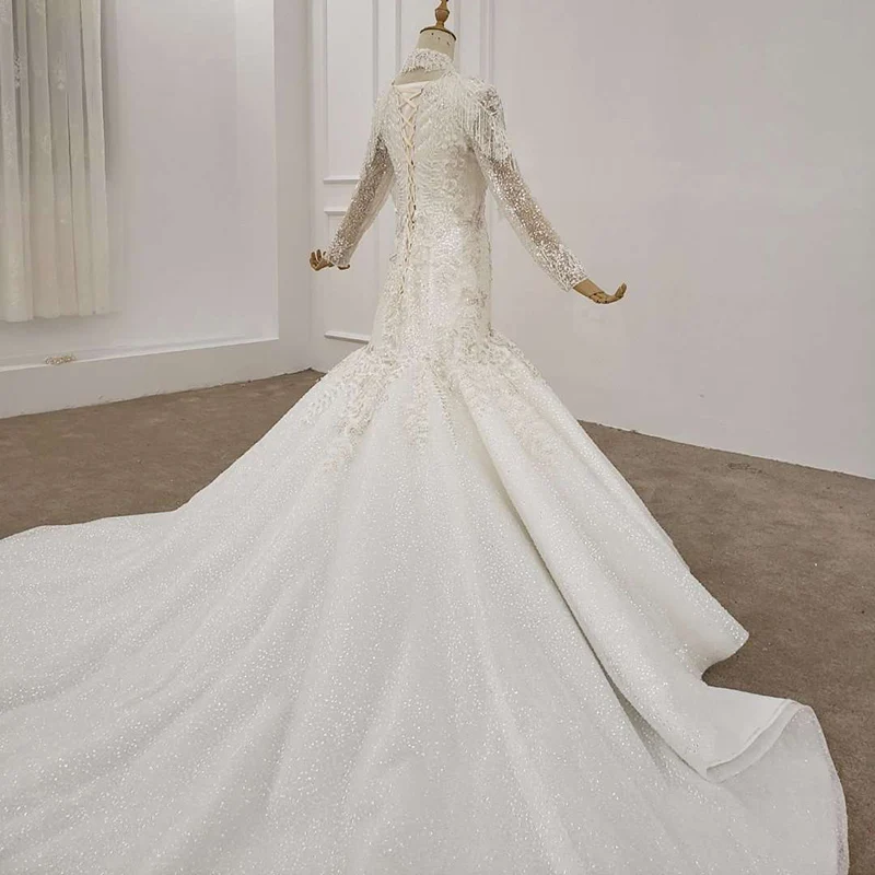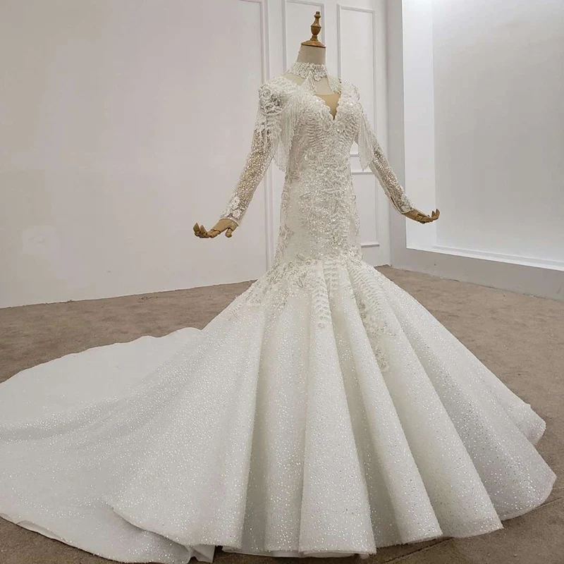 Special Offer HTL1287 فستان زفاف فاخر للغاية أبيض حورية البحر مطرز بالخرز شرابة 2020 دانتيل على شكل حرف V كم طويل اكسسوارات السيارات 2020 Discount 55% Today!