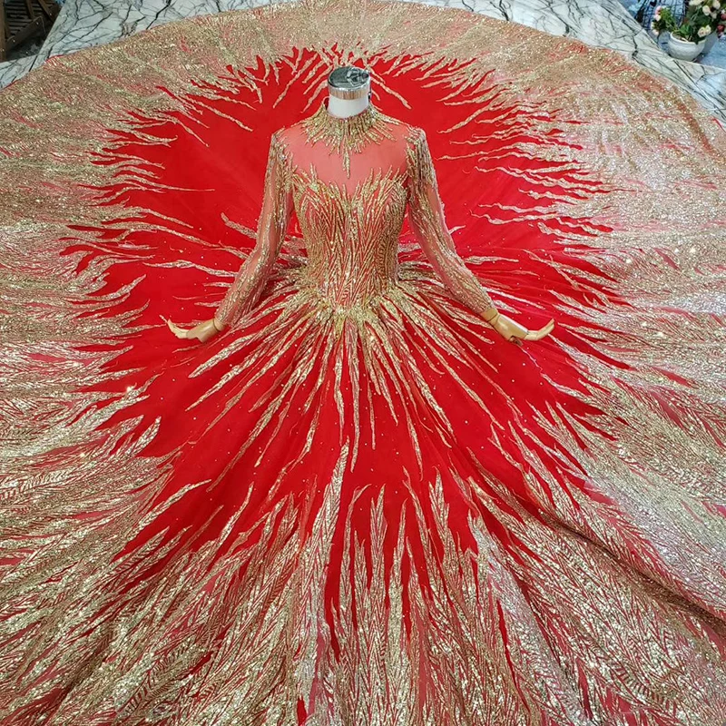 Special Offer HTL795 مسلم فستان الزفاف مع الزفاف الحجاب الديكور نمط عالية الرقبة طويلة الأكمام الذهبي الدانتيل ثوب زفاف الأحمر Vestido Novia Discount 50% Today!