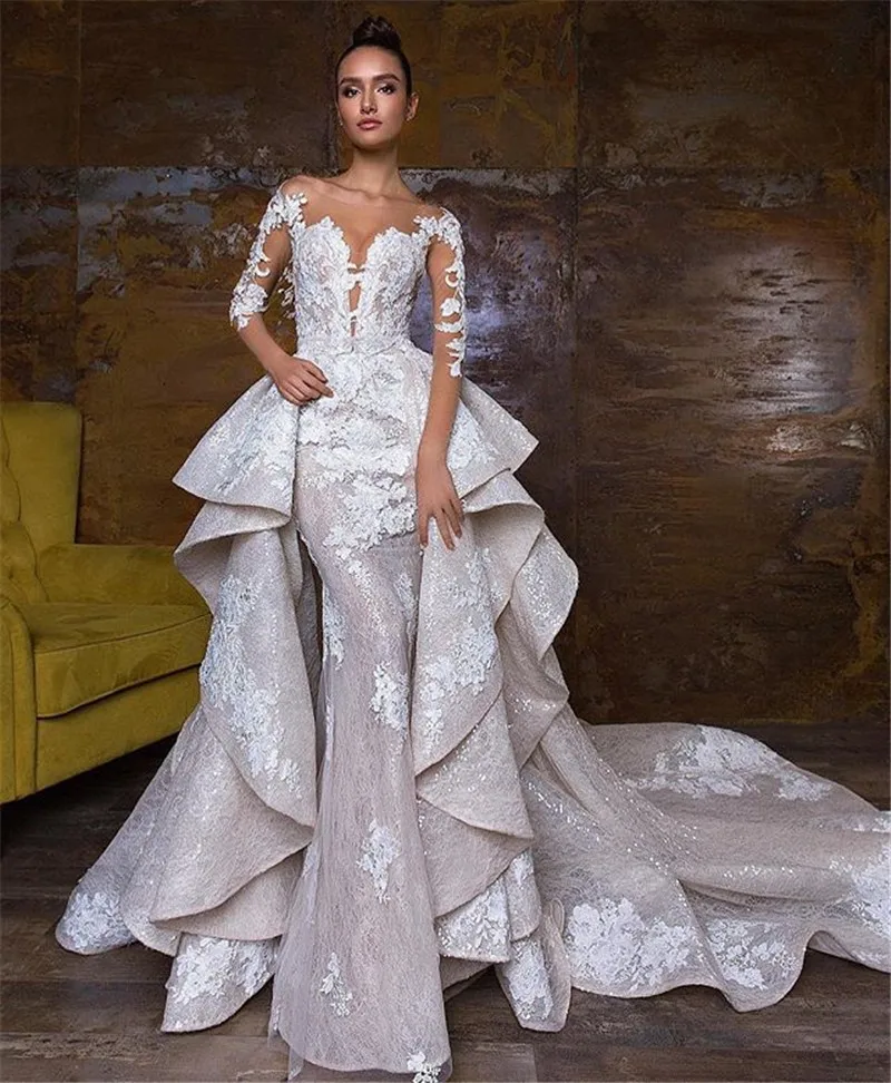 Special Offer الفاخرة المتدرج قطار حورية البحر فساتين الزفاف رداء دي Mariee رائع الدانتيل فستان عروس مع الأكمام Vestido دي Noiva Discount 37% Today!