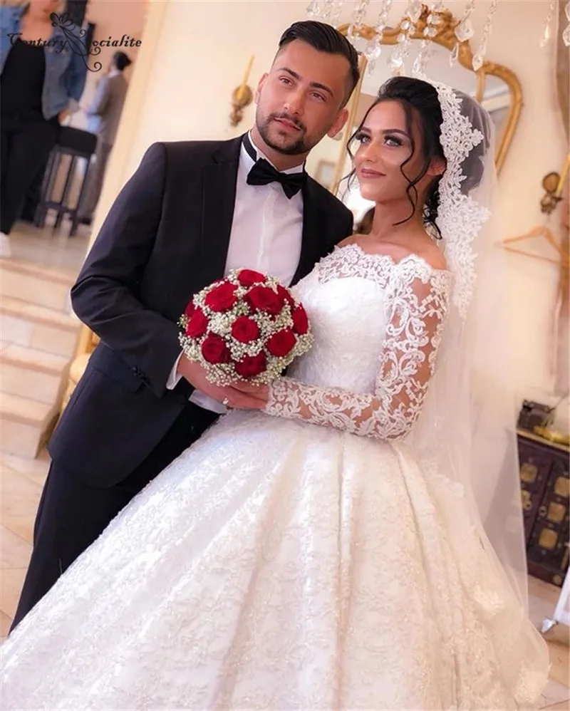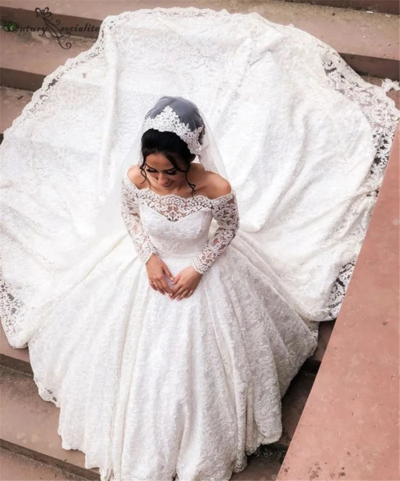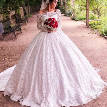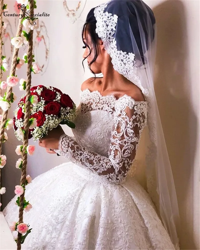 Special Offer Vestido De Noiva الأميرة الكرة ثوب فساتين زفاف دانتيل كم طويل زي العرائس قبالة الكتف فساتين العروس رداء دي ماري Discount 22% Today!