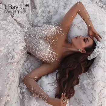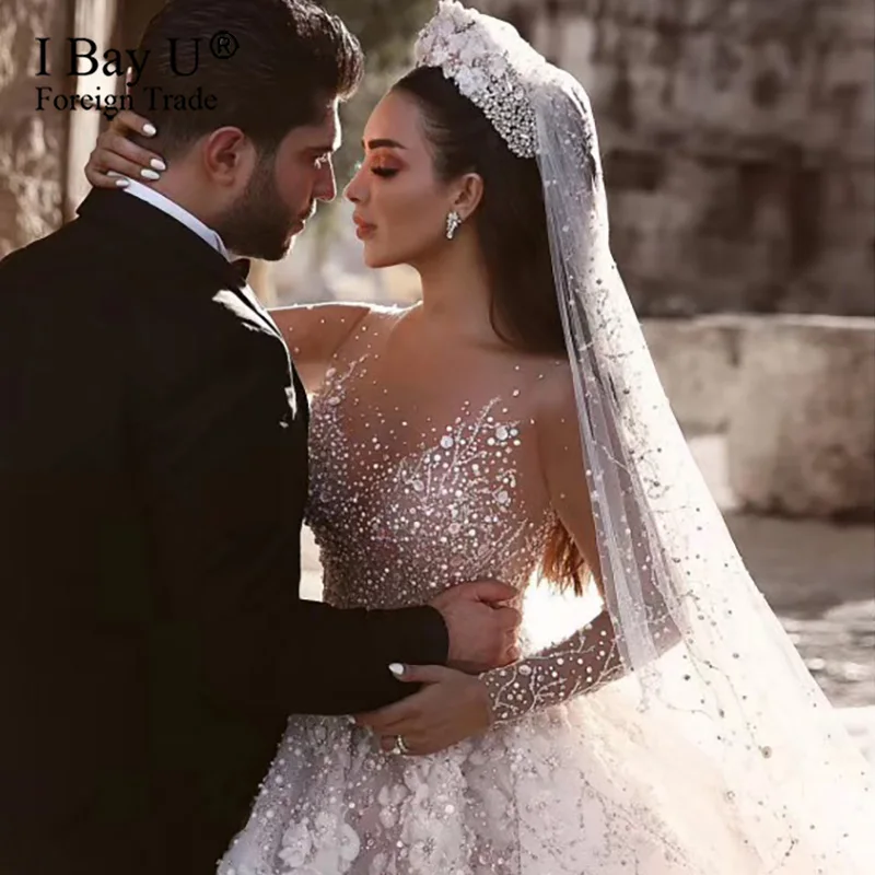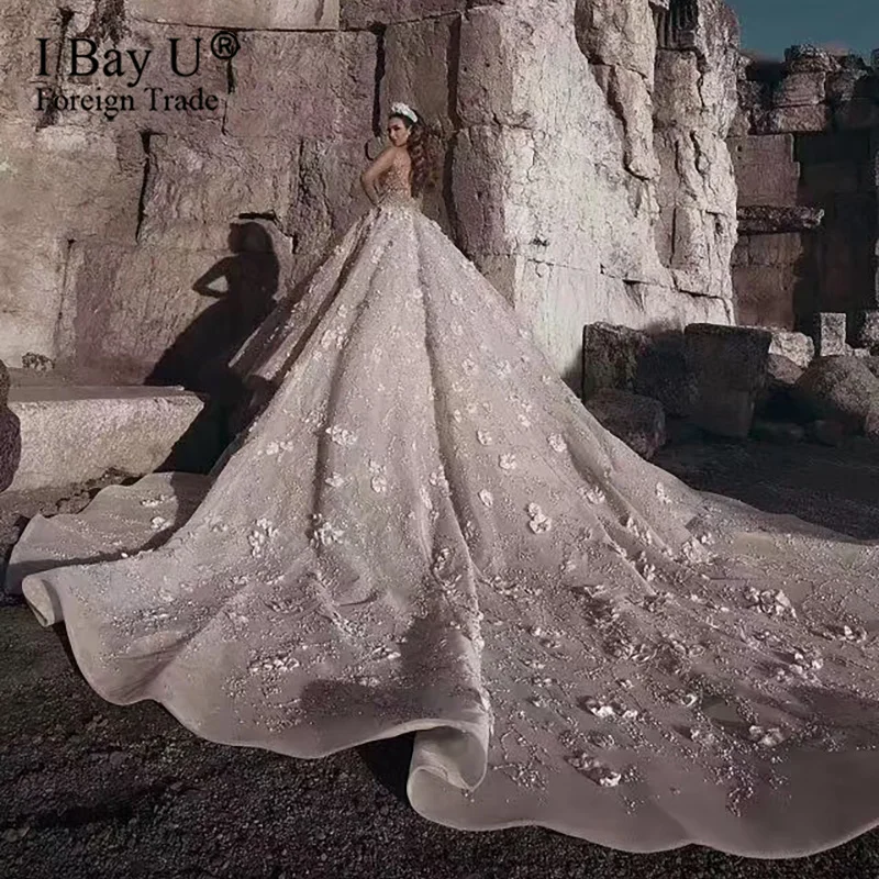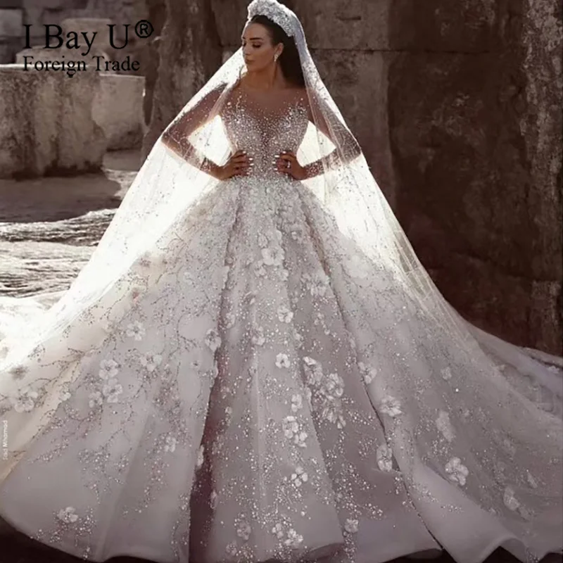 Special Offer مذهل كريستال فاخر عاجي كم طويل فساتين زفاف 2020 كامل الخرز ثلاثية الأبعاد الزهور الترتر فستان زفاف Discount 0% Today!