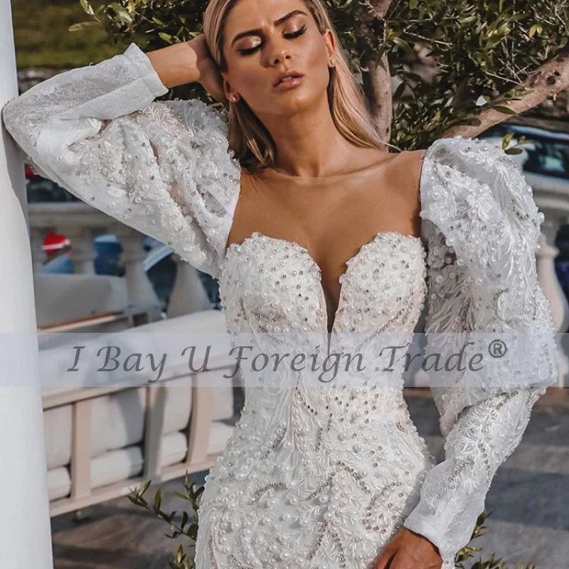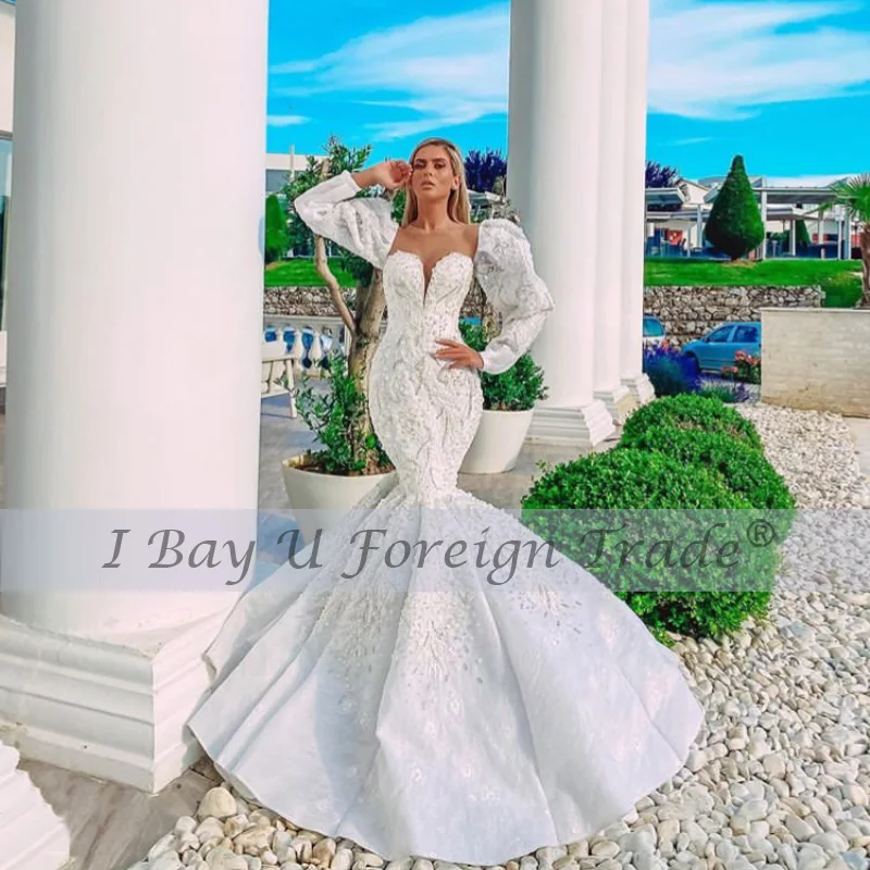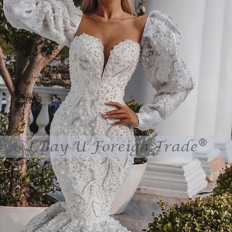 Special Offer اللؤلؤ الفاخرة حورية البحر فستان الزفاف كم طويل 2021 جديد الثقيلة الخرز ثوب زفاف منتفخ الكتف فستان الزفاف Discount 5% Today!