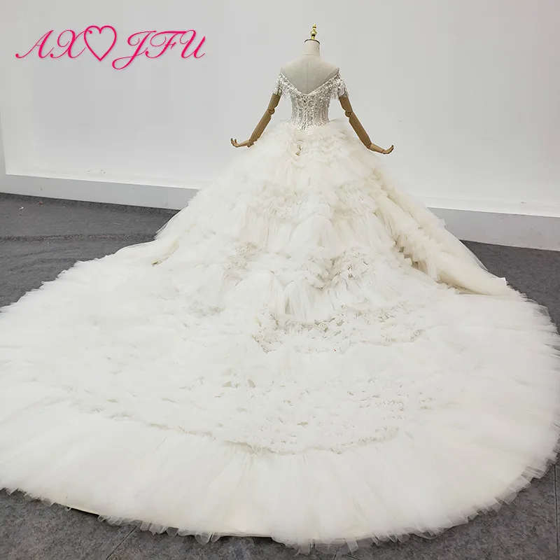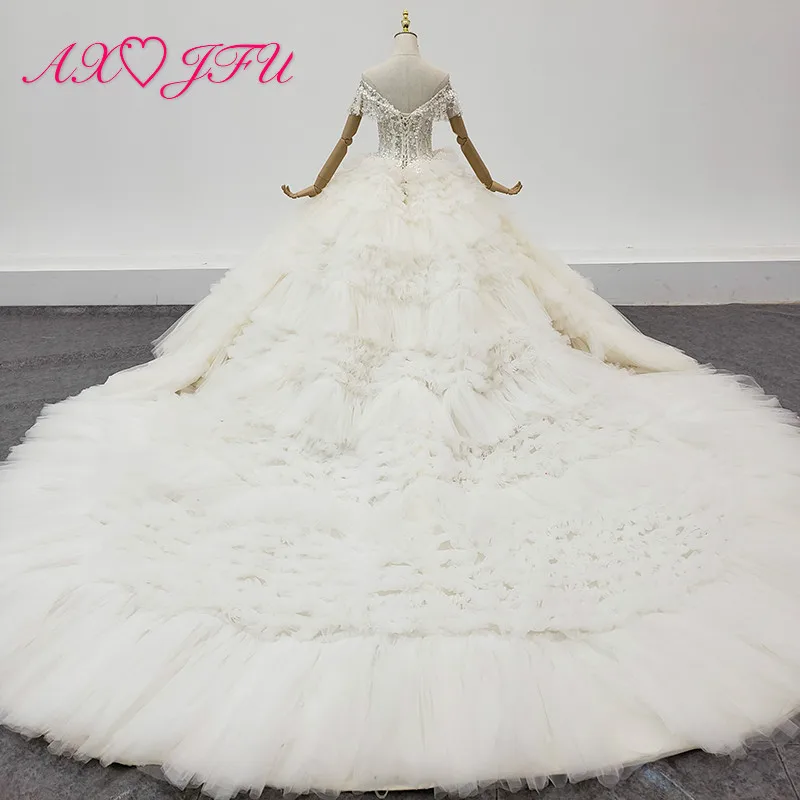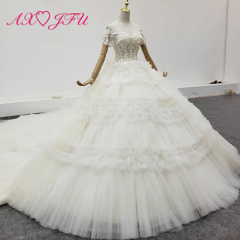 Special Offer AXJFU الفاخرة الأميرة الديكور كريستال زهرة صغيرة اليدوية قارب الرقبة الكشكشة الأبيض الدانتيل العروس فستان الزفاف 100% صور حقيقية Discount 50% Today!