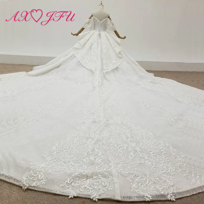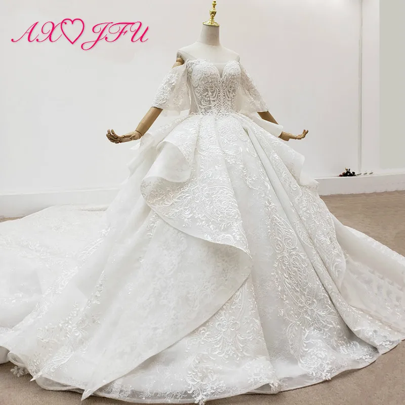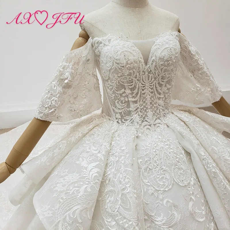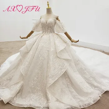 Special Offer AXJFU الفاخرة الأميرة الخرز زهرة الكريستال الدانتيل اليدوية قارب الرقبة العروس نفخة الأكمام فستان الزفاف الأبيض 100% صور حقيقية Discount 50% Today!