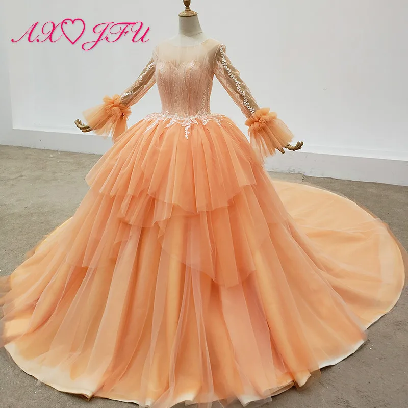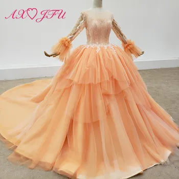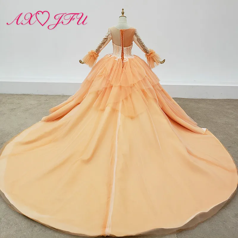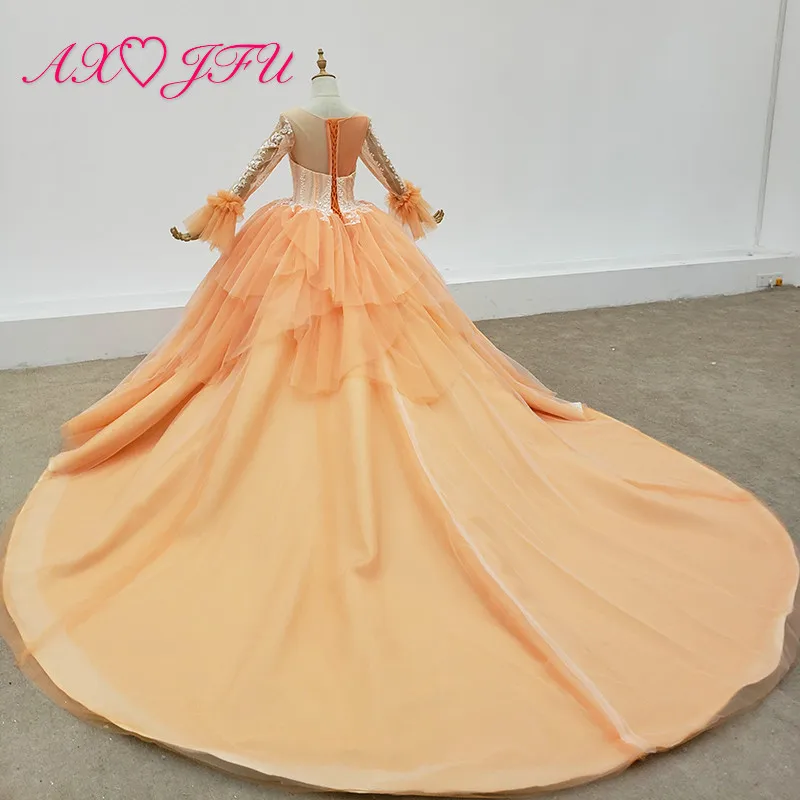 Special Offer AXJFU الفاخرة الأميرة الخرز كريستال زهرة البرتقال الدانتيل اليدوية س الرقبة طويلة مضيئة كم العروس فستان الزفاف 100% صور حقيقية Discount 50% Today!