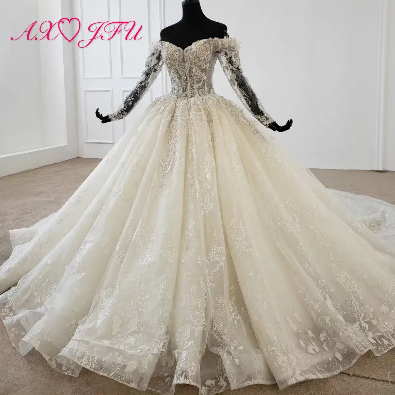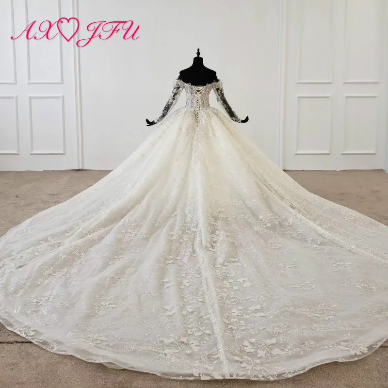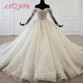 Special Offer AXJFU الفاخرة الأميرة الدانتيل الأبيض قارب الرقبة العروس طويلة الأكمام الوهم الخرز كريستال الأزرق زهرة الشمبانيا فستان الزفاف 1699 Discount 50% Today!