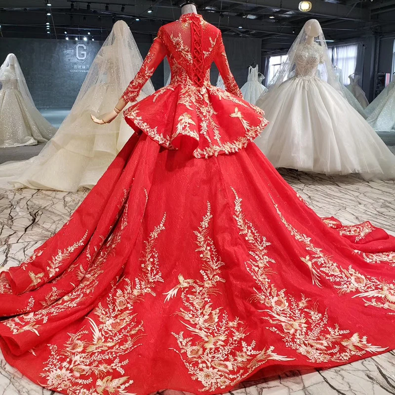 Special Offer BGW 31312ht 2020 ثوب حفلة مسلم طويل الأكمام الدانتيل تول فستان الزفاف الأحمر مع الذيل النمط الصيني نمط فستان زفاف Vestido Discount 50% Today!