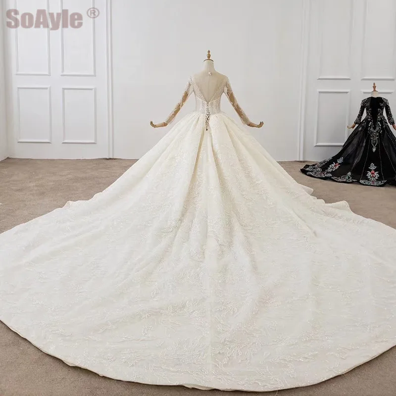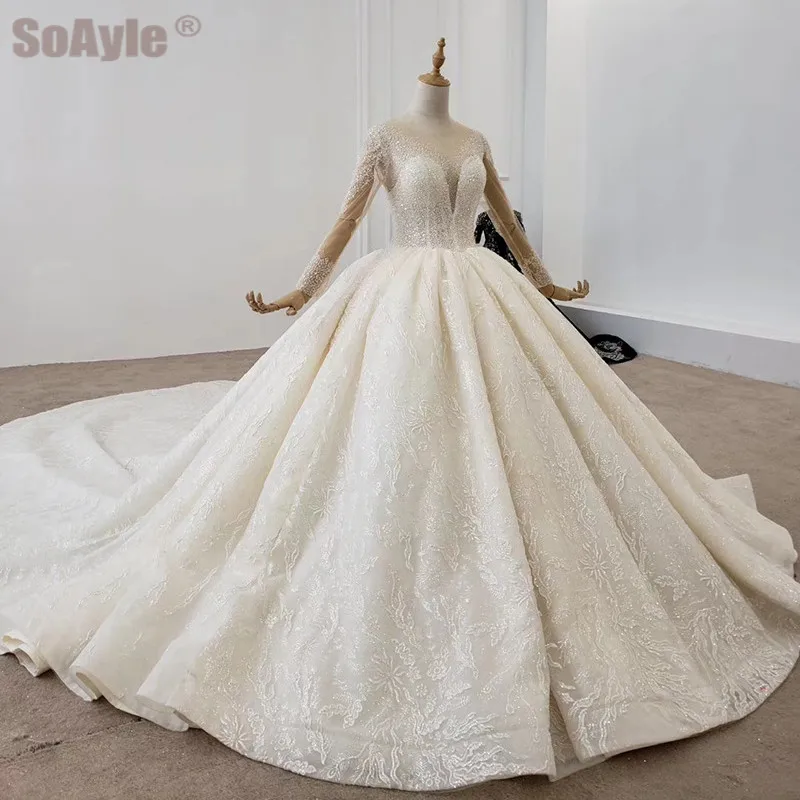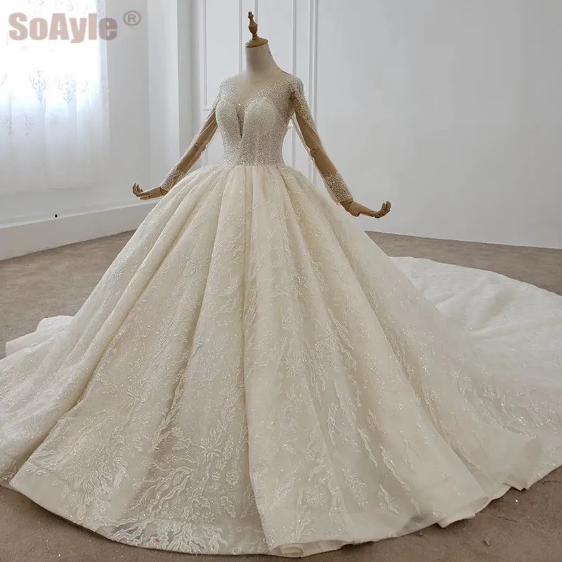 Special Offer SoAyle فساتين الزفاف 2020 الكرة ثوب مكشكش اليدوية الفاخرة مطرز الدانتيل زين ربطة القوس فيونكة قارب الرقبة فستان الزفاف في دبي Discount 0% Today!