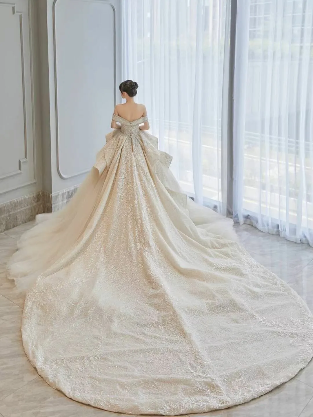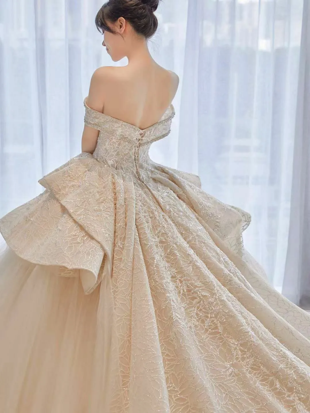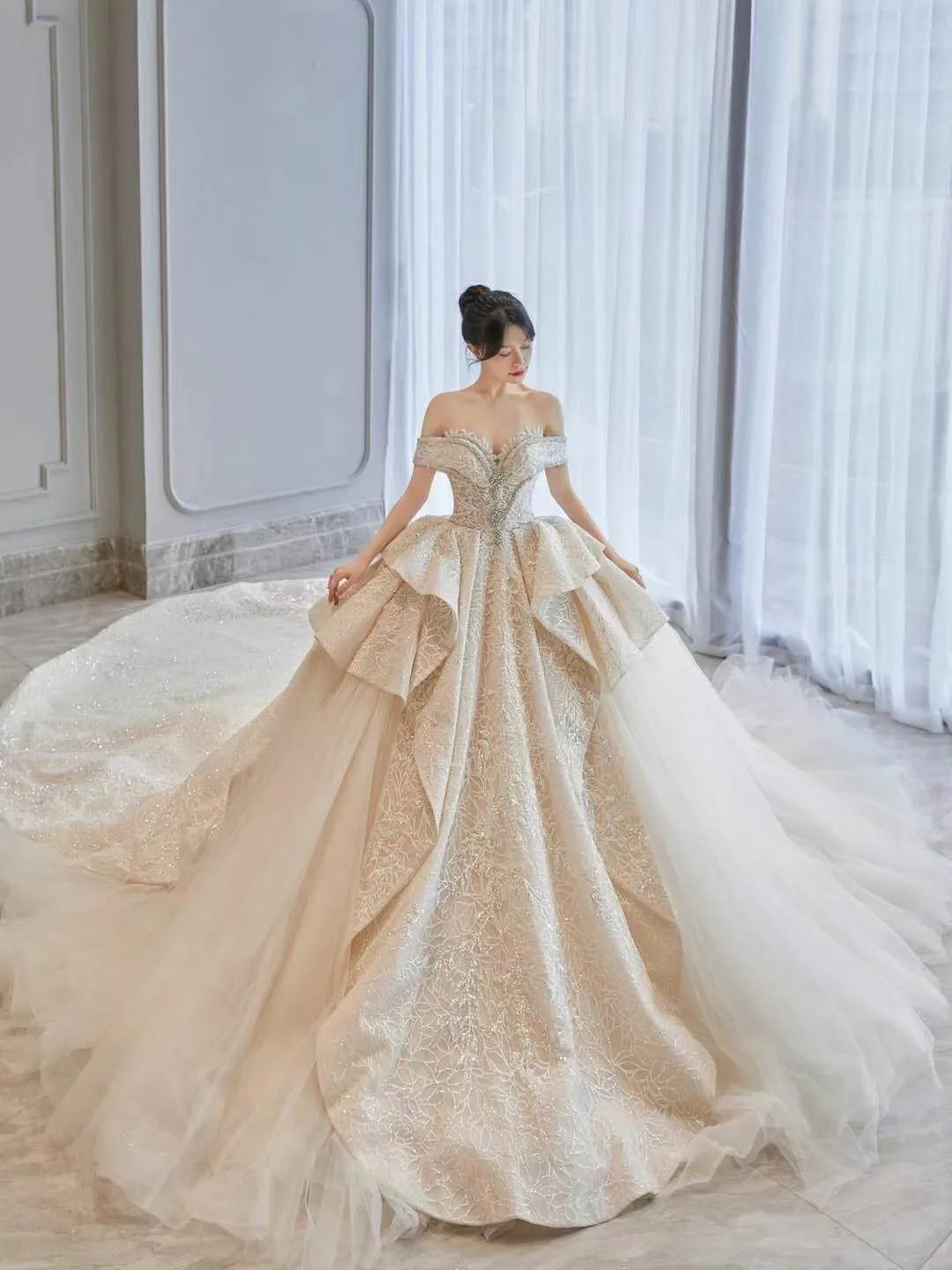 Special Offer فساتين زفاف فاخرة باللون الذهبي العربي 2021 ترتر الأميرة فستان الزفاف الملكي الخرز على شكل قلب الأميرة سباركلي Discount 19% Today!