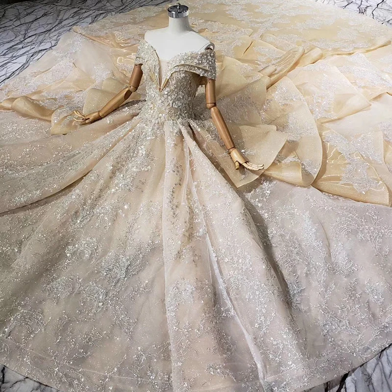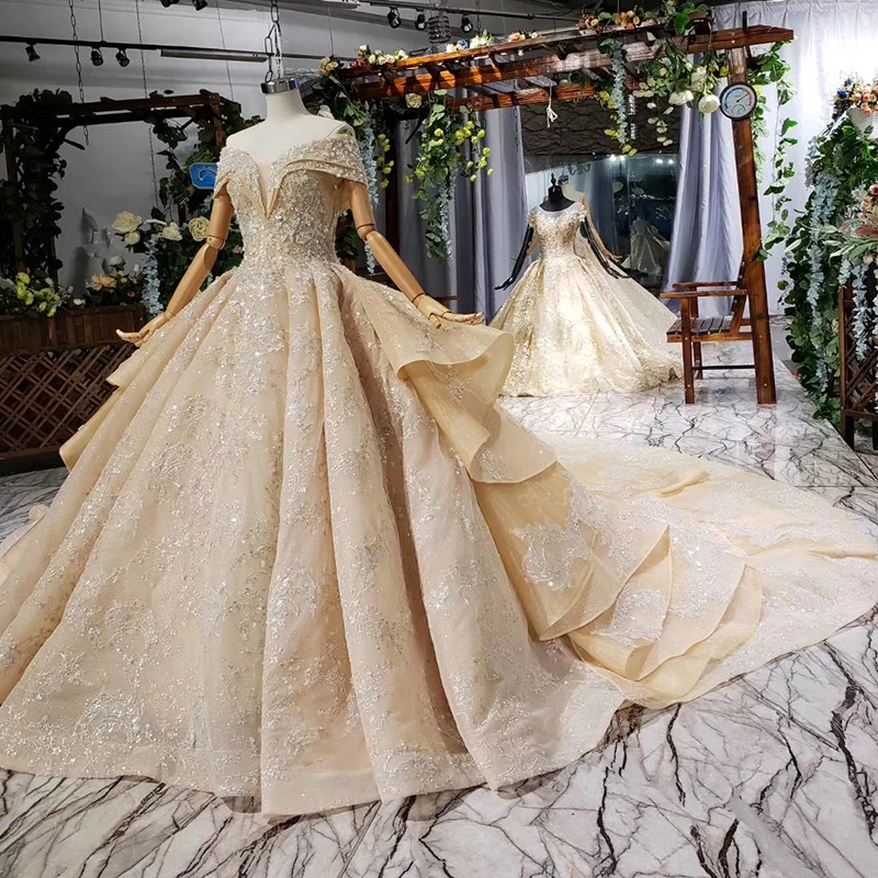 Special Offer فستان زفاف فاخر مع ذيل ملكي مطرز بكريستال مطرز بطيات فساتين زفاف للعروس خارج الكتف دانتيل زي العرائس Discount 29% Today!