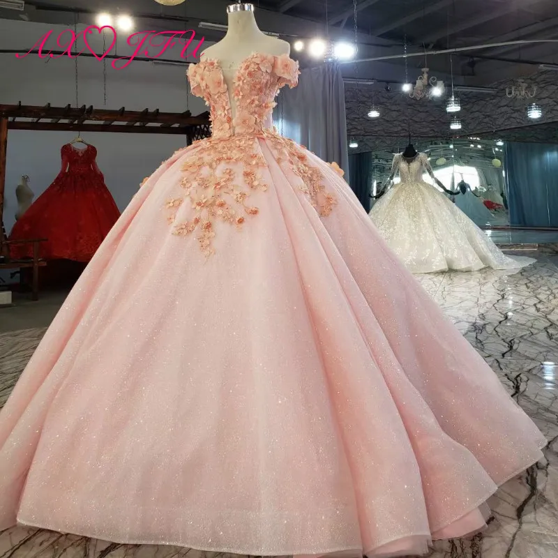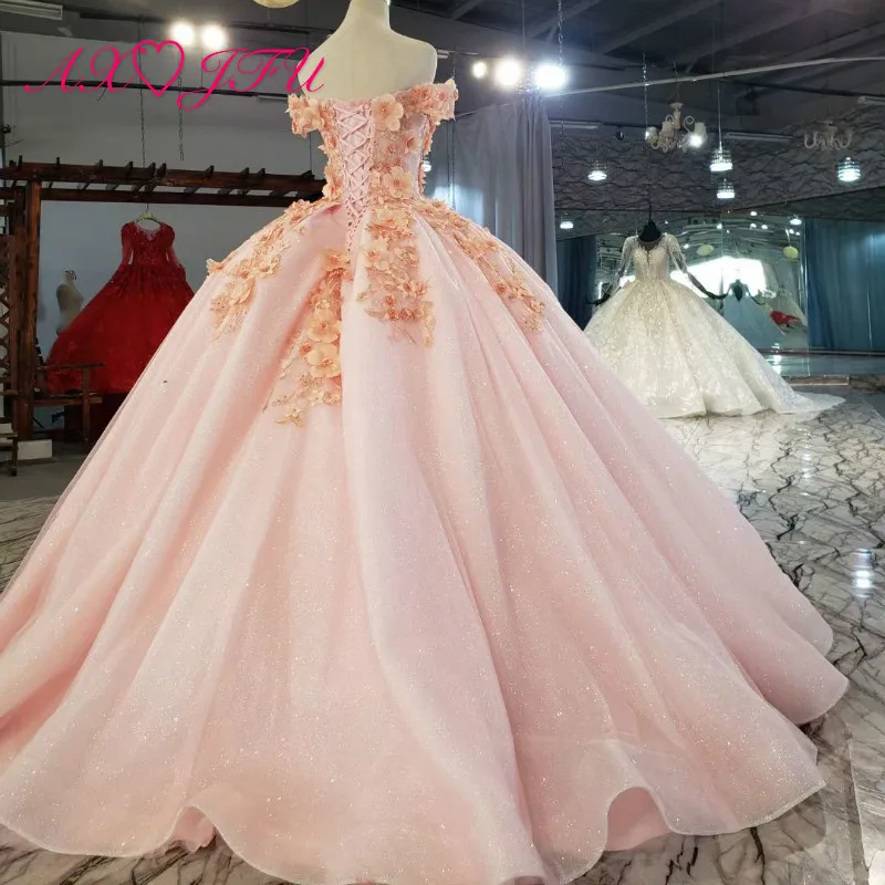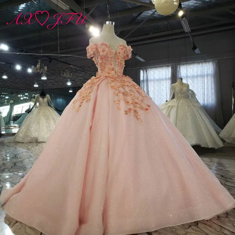 Special Offer AXJFU الفاخرة الأميرة الخرز اللؤلؤ الأزرق زهرة الدانتيل اليدوية قارب الرقبة الوهم العروس الوردي ارتفع فستان الزفاف 100% صور حقيقية Discount 50% Today!