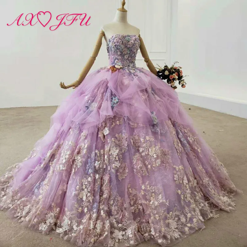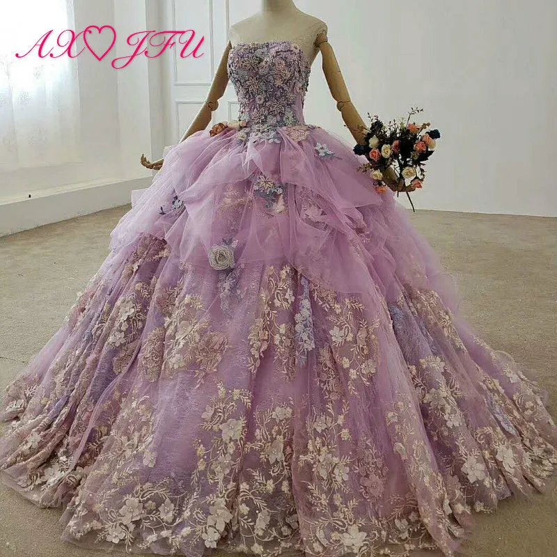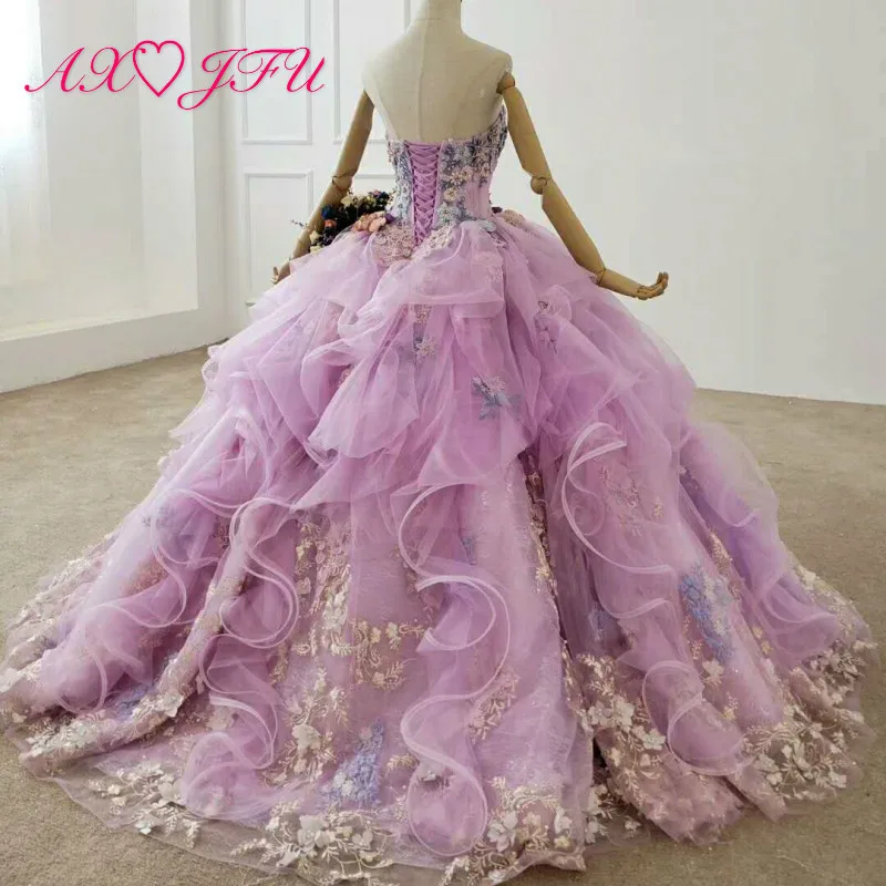Special Offer AXJFU الفاخرة الأميرة الأرجواني الوردي الدانتيل فستان الزفاف حمالة الخرز اللؤلؤ ارتفع التطريز زهرة الكشكشة فستان الزفاف Discount 50% Today!