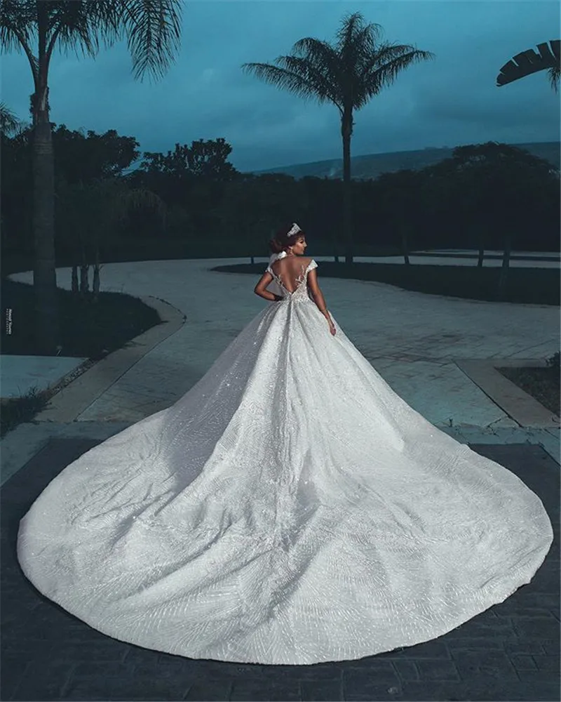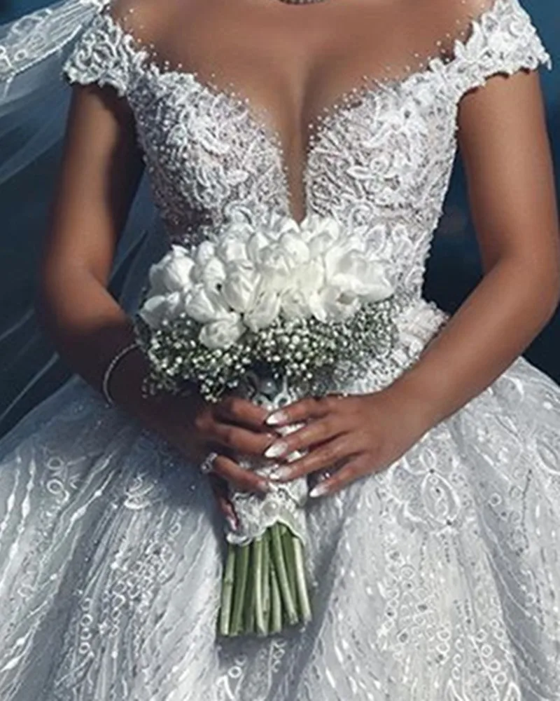 Special Offer الفاخرة عميق الخامس الرقبة الكرة ثوب الديكور الدانتيل فستان الزفاف 2019 عارية الذراعين تول الزفاف أثواب الأكمام كاب مع اللؤلؤ رداء دي Mariee Discount 42% Today!