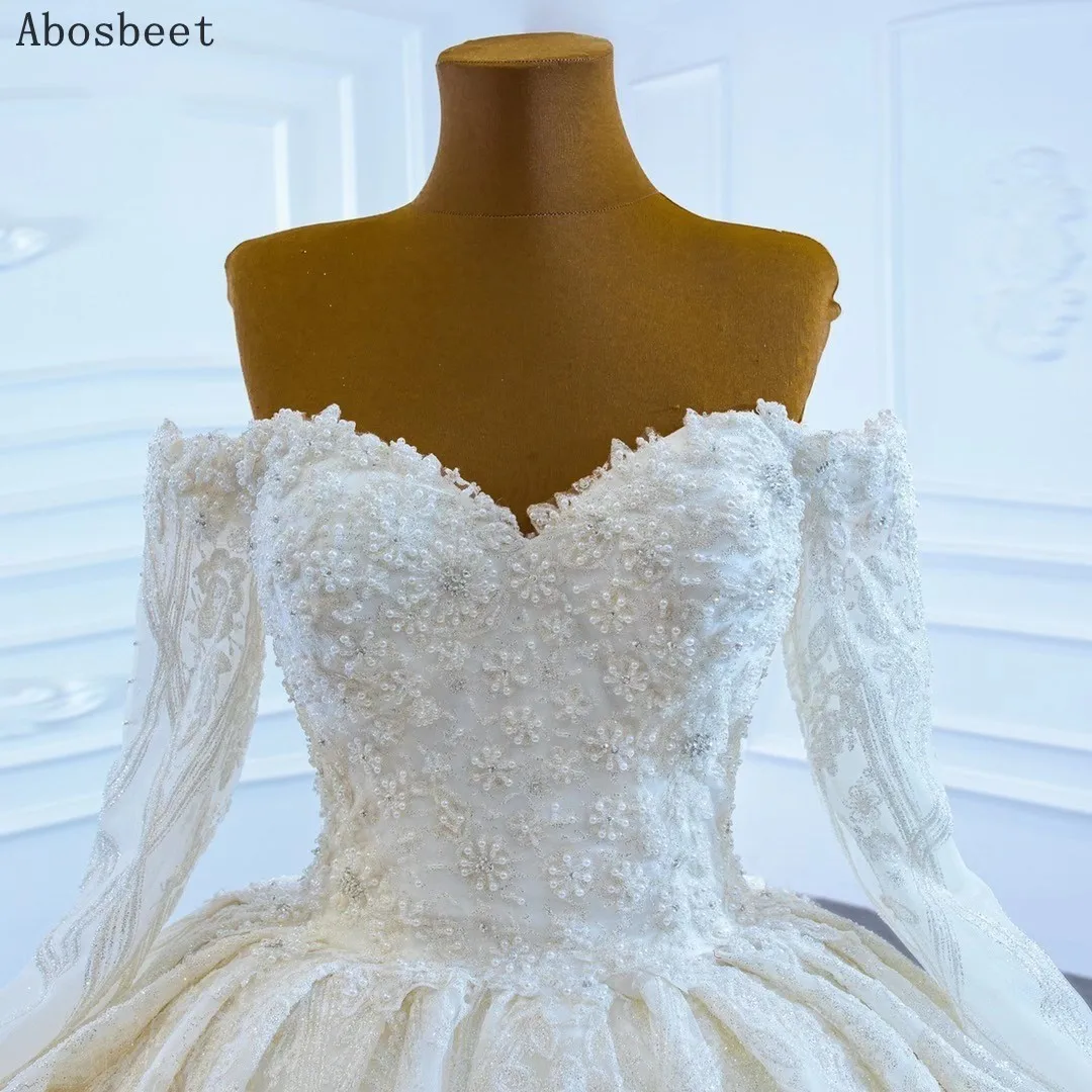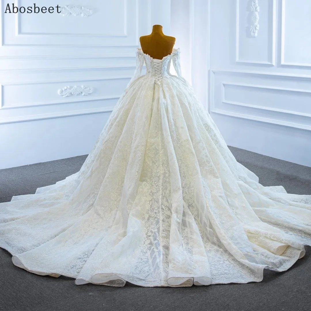 Special Offer جديد فاخر الكرة ثوب الزفاف براق الديكور التطريز الدانتيل ثوب زفاف الزفاف كم طويل قطار أبيض/عاجي Discount 5% Today!