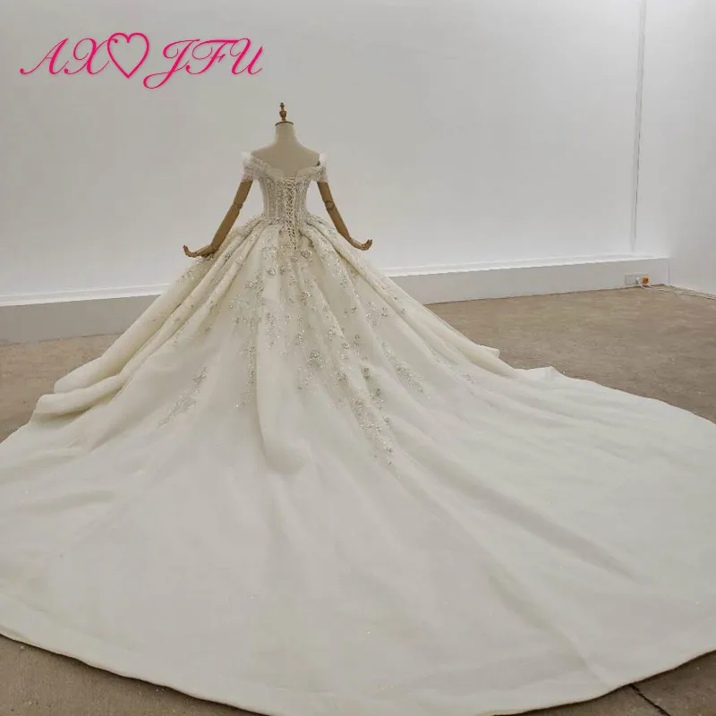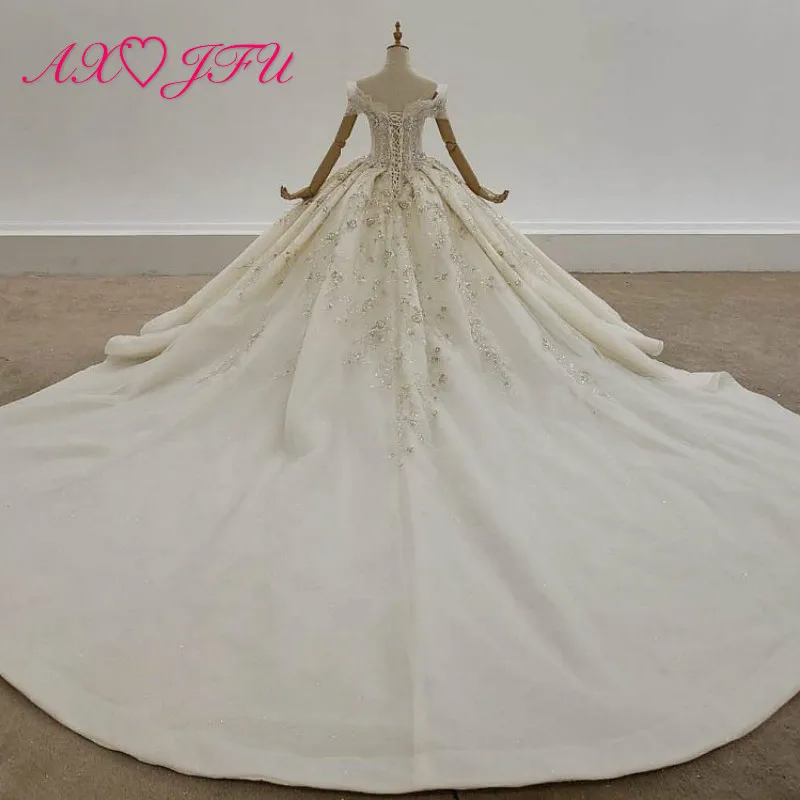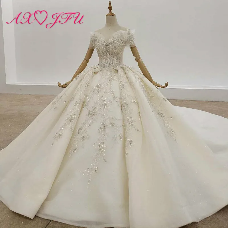 Special Offer فستان زفاف فاخر من AXJFU مطرز بالزهور والكريستال والدانتيل الأبيض مصنوع يدويًا على شكل قلب العروس الشامبانيا بأكمام قصيرة 99489 Discount 50% Today!
